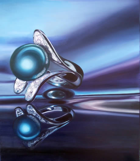 Schilderij Blauw Paars Zilver Bol Vrouwelijk Strak Weerspiegeling Parel Cadeau Geschenk Ring Sieraad Edelsteen Schaduw Diamant Gift Steriel Platina Diamantjes Glimmend Reflectie