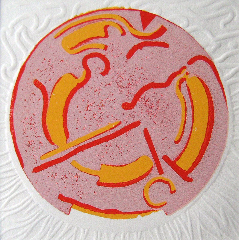 Interpretatie van de top van mijn vinger. O ja, die ribbels krijg je als je te lang in bad zit of een grote afwas doet. In lijst van 40x30cm / signatuur staat apart met kleine rode linostempel in de passe partout / oplage 20