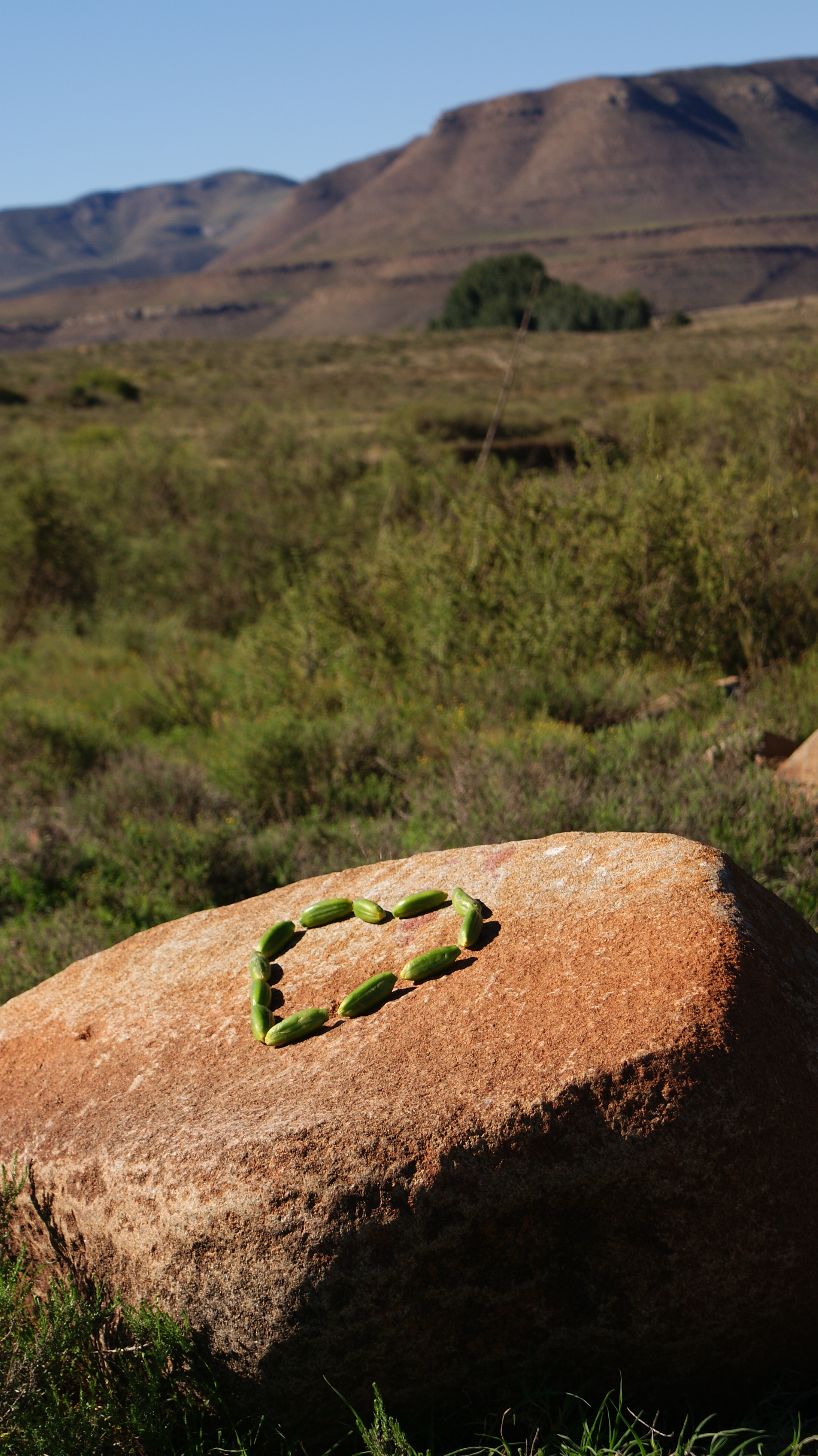 Tijdens mijn stage in Zuid Afrika heb ik dit hart neergelegt op een steen op het landgoed Deep Kloof in de kleine Karoe. Het zijn zaden van een cactus. De foto is in verschillende grootte en op verschillend materiaal te verkrijgen