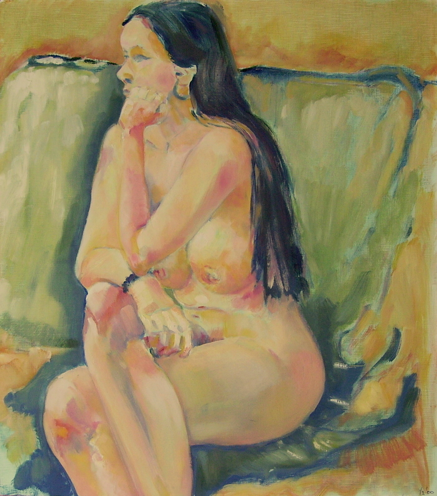 Naakt Realistisch Olieverf Zittend Geel/groen
