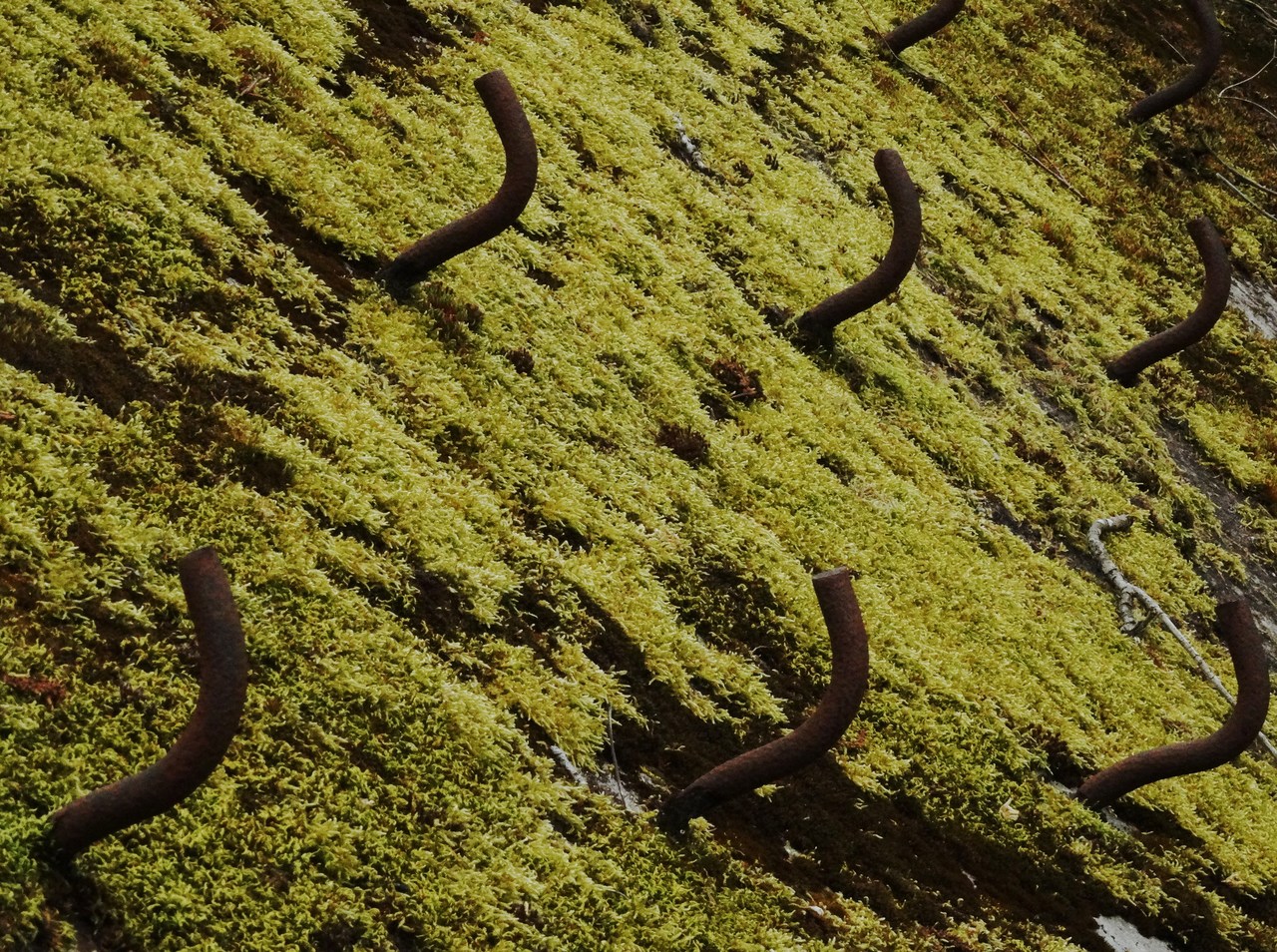 Synergie: de natuur / komt altijd met oplossingen. // Hier werd beton gezaaid / en nadat mos zich had gevestigd / en het oppervlak glibberig maakte / groeide in de loop van tientallen jaren / ijzeren beugels / de klimmers terwille.