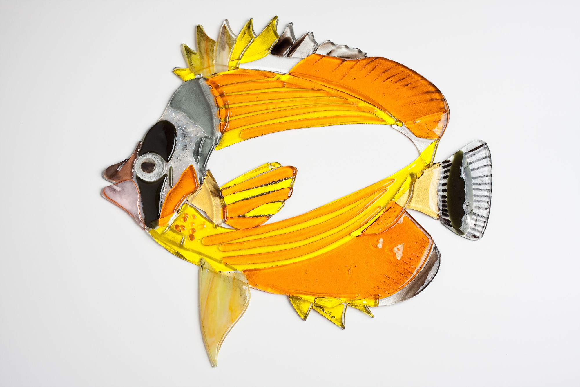 Vissen zijn voor mij een onuitputtelijke inspiratiebron. Gebruikt materiaal Spectrum System 96. Glass fusion techniek.
