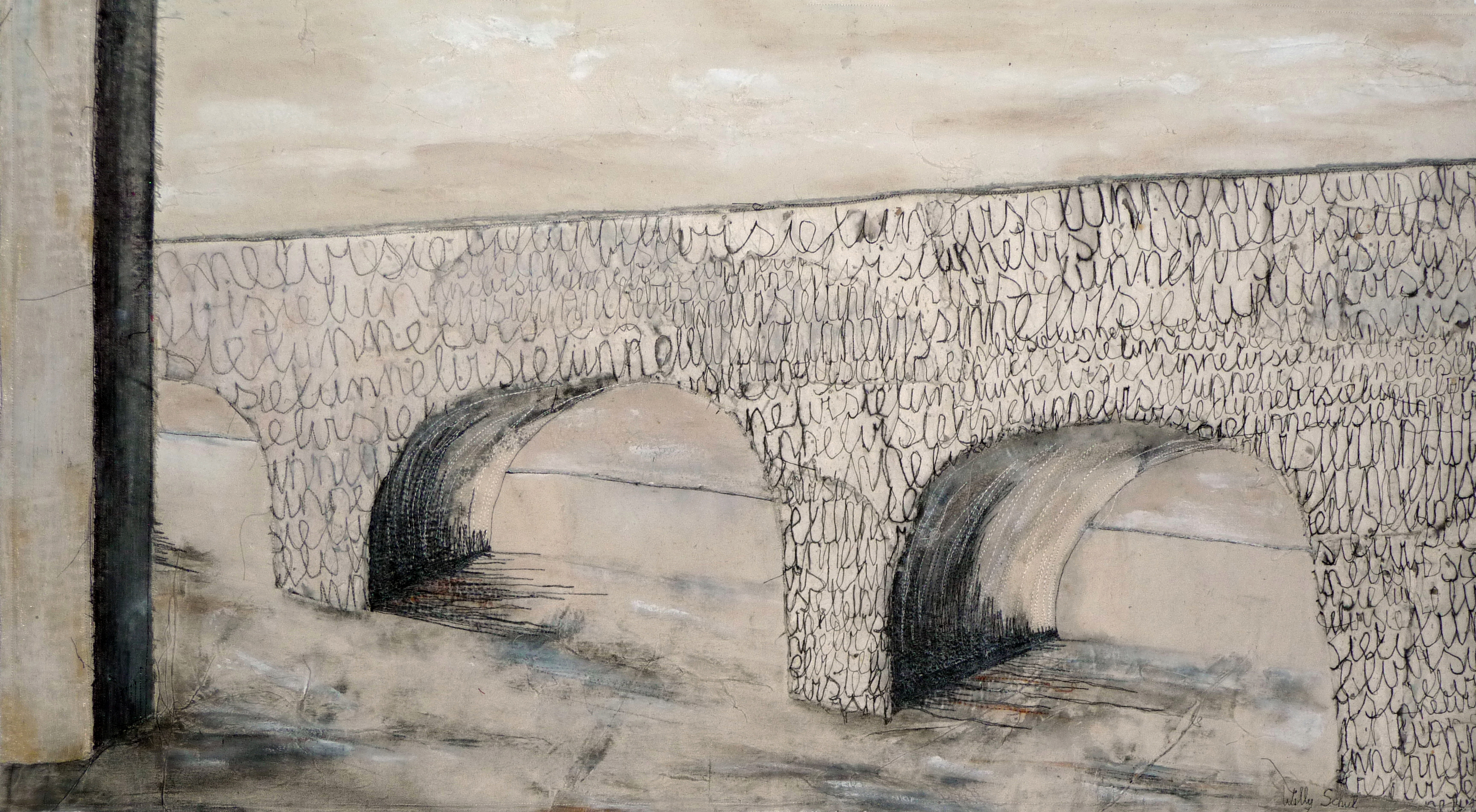 Wit Mixed Media Textiel White Letters Brug Machine Writing Bridge Embroidery