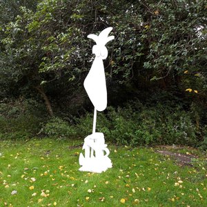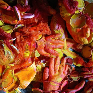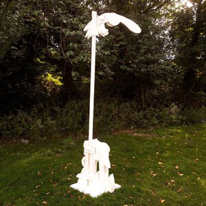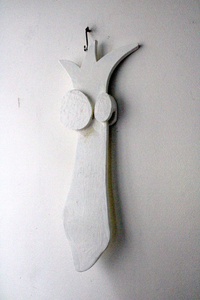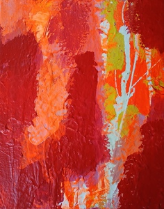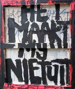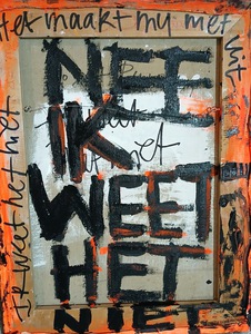met figuratieve elementen abstract met figuratieve elementen, groot doek geschilderd op stevig polyester zeil, is opgerold, om op te slaan of te vervoeren. Het dient te worden opgespannen, dat werkt met keilbouten in de muur aan de vier hoeken en dan vast trekken of met bijgelverde stokken aan de zijkant om het vast te bevestigen en strak te trekken,