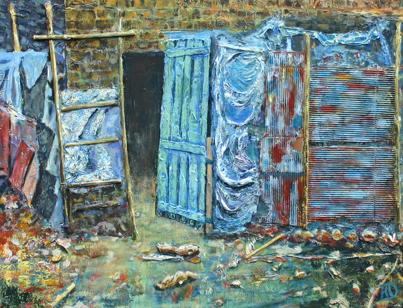 Voor mijn afstudeer werk heb ik onder meer gekozen voor het thema armoede, hetgeen zich vooral uit in de sloppenwijken. Ik heb voor ieder werelddeel een voor dat deel typische sloppenwijk gemaakt. De schilderijen zijn gemaakt in collage en andere toegepaste technieken, geschilderd in acryl. Een slob uit Roemenia