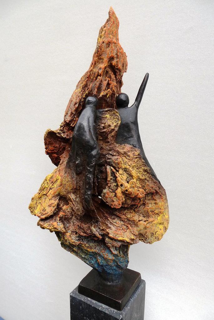 Dit is het tweede beeldje voor "Het Feest van de Geest". Ik heb het de titel "In vuur en vlam" gegeven. Ook dit beeld is prachtig in vurige kleuren gepatineerd. Het hout wat als basis diende was weer zo´n gift van de natuur. Het had al de vorm van een vlam. Ik mocht het afmaken.