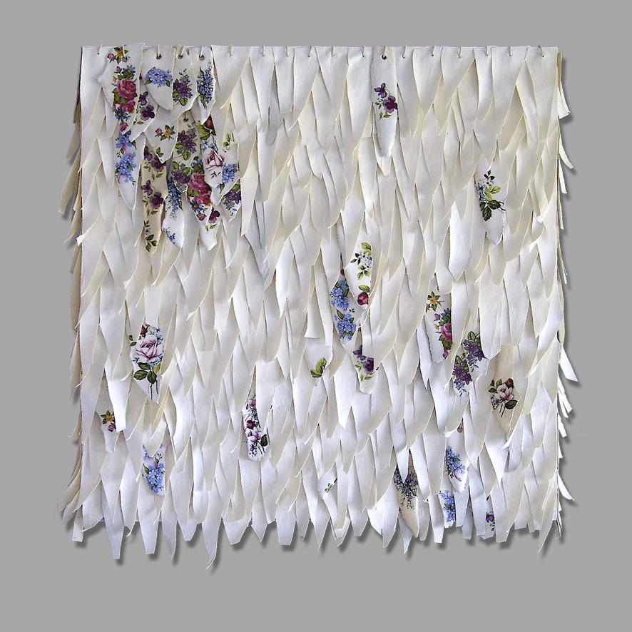 Wandobject bestaande uit keramische en textiele elementen. Op enkele keramische elementen zijn bloemafbeeldingen aangebracht. Het werk heeft een nostalgisch karakter.