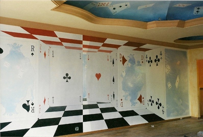 Dit is de linker muur. De figuren zijn weg en de deur wordt gesloten. Ik heb het effect willen creëren dat je in een ruimte komt waar spelen de realiteit vormt. Deze ruimte bevindt zich in een vrije droomwereld tussen de wolken. Eén stap verder op de tegels van de vloer (geschilderd) en je komt in het land zonder zwaartekracht.