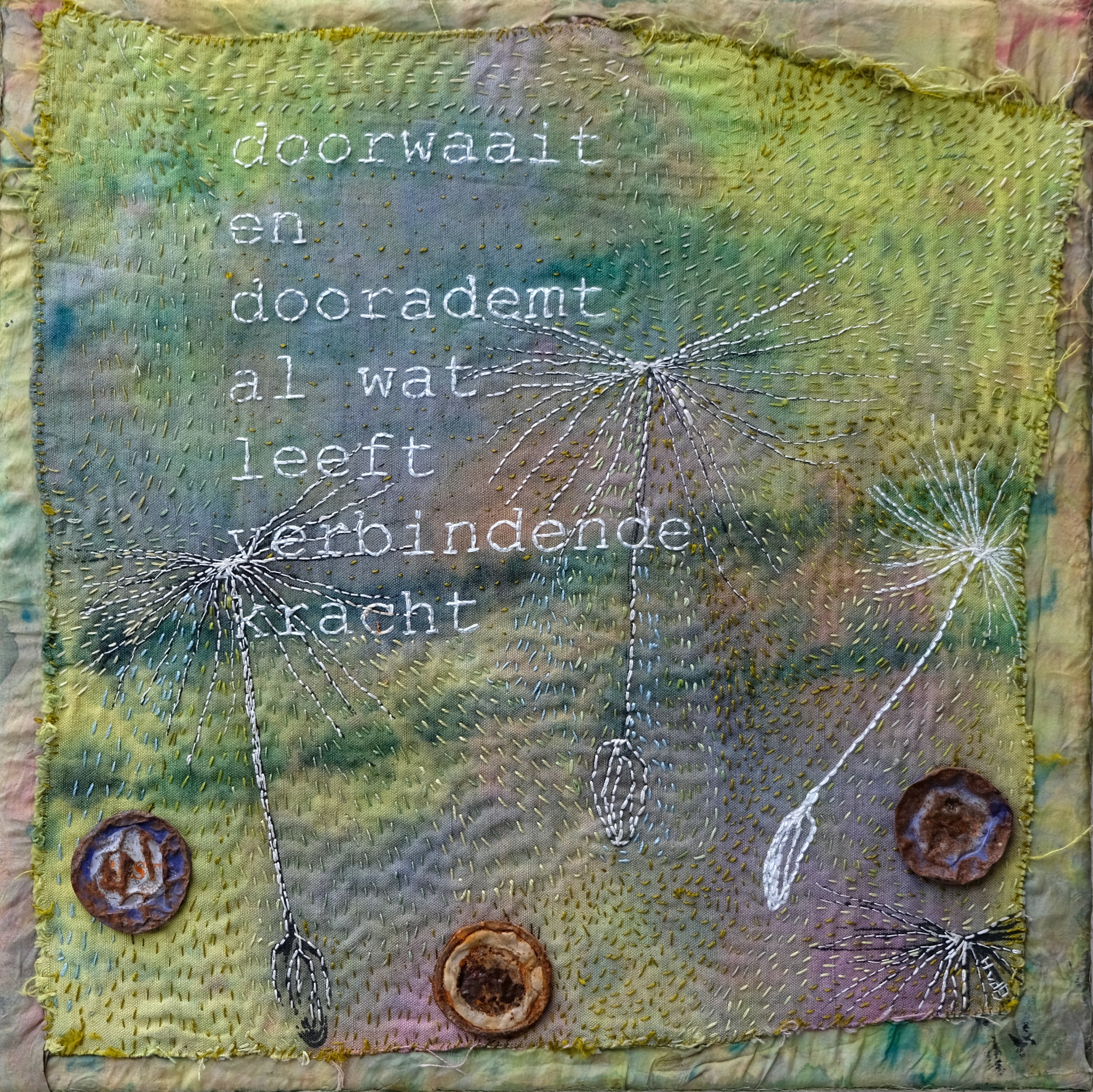 Wegwaaiende zaadjes als beeld voor de Geest die rondwaait. Handgeborduurd op handgeverfde textiel