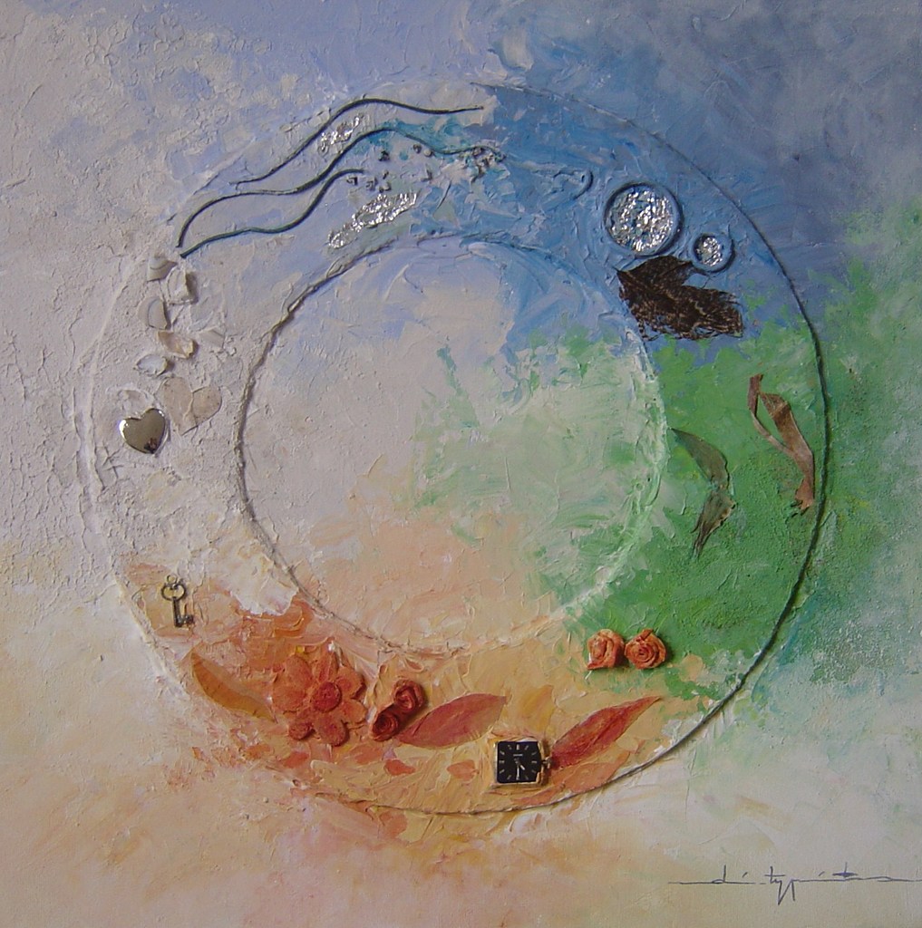 De cirkel kent geen begin en eind. De kleuren blauw en wit - voor lucht en water, met daarin luchtbellen en veertje als symbool voor vrijheid, en schelpjes, zoutkorrels en glans van zilver : leven. De kleur groen is kleur van hoop en staat voor aarde met boomschors en blaadjes.De oranje-rode kleur is vuur- warmte. De roosjes en bloemen zijn voor vrolijkheid en de harten van de liefde. Het klokje is voor de tijd. De sleutel is symbool voor de toekomst die open ligt.