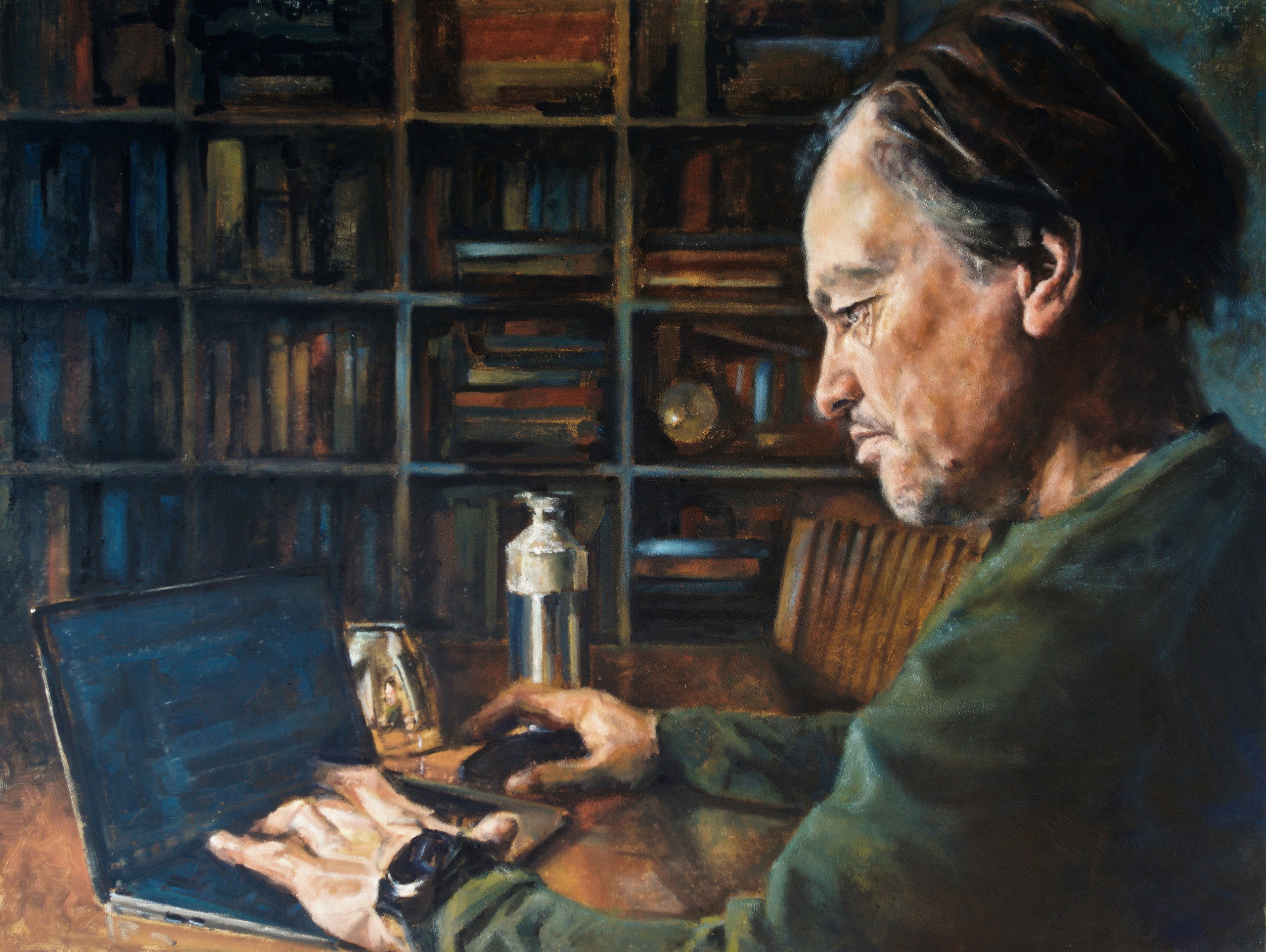 2021, working from home, talking and collaborating via a computer screen. Science fiction described as “the future” 40 years ago. All of sudden Covid made that this became reality in a matter of weeks. A new opportunity for portrait painting with a model at your disposal every day, all day.