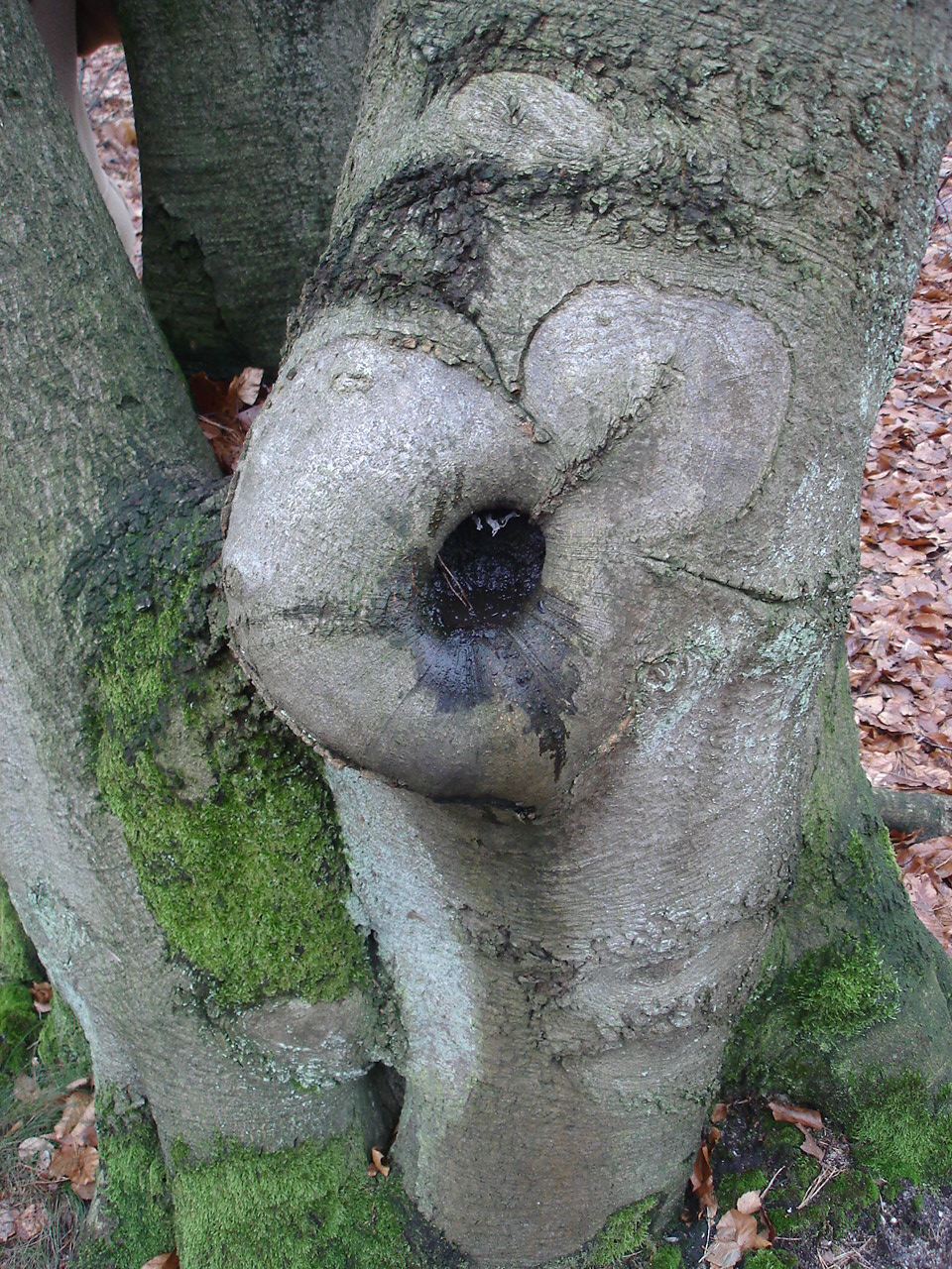 Beuk met hart tussen de stammen en aan een stam.