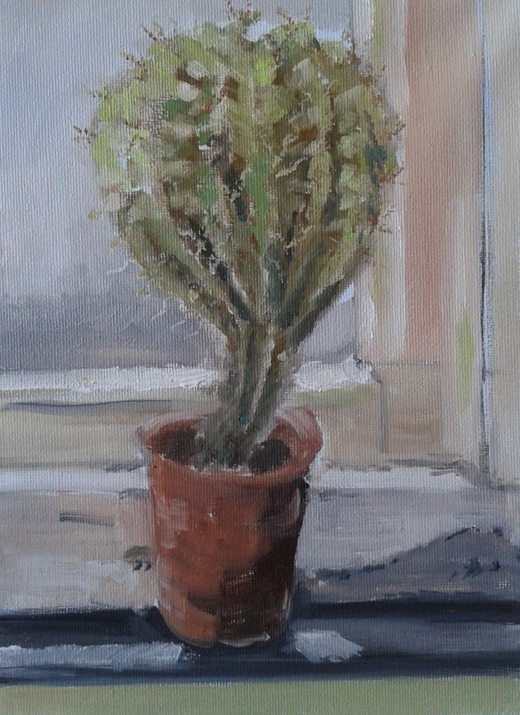 De cactus in het raam op de gang van de Mariaschool schreeuwde het uit om geschilderd te worden. Het licht viel er zo mooi op ...