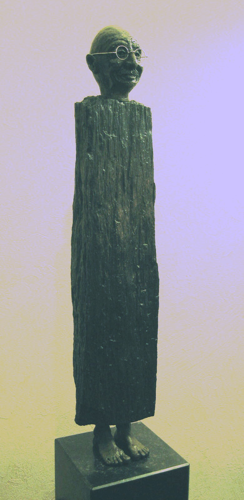 Mijn bewondering voor Gandhi en zijn markante hoofd waren voor mij aanleiding tot het maken van dit beeld. Er is gekozen een combinatie van metaal (brons en zilver) met natuursteen (Chinese leisteen). De grootste uitdaging bleek uiteindelijk nog het vinden van een goede foto van deze Indiase leider (van Ben Kingsley, de acteur die de rol van Gandhi vertolkt in de gelijknamige film waren er meer dan genoeg), maar historische foto's van Gandhi bleken een zeldzaamheid. Ondanks het gebrekkige bronmateriaal is dit eerbetoon aan Mahatma Gandhi, die werd vermoord in hetzelfde jaar dat ik het levenslicht zag treffend te noemen. Unicaat Afmetingen zijn inclusief sokkel (sokkelhoogte:12 cm)