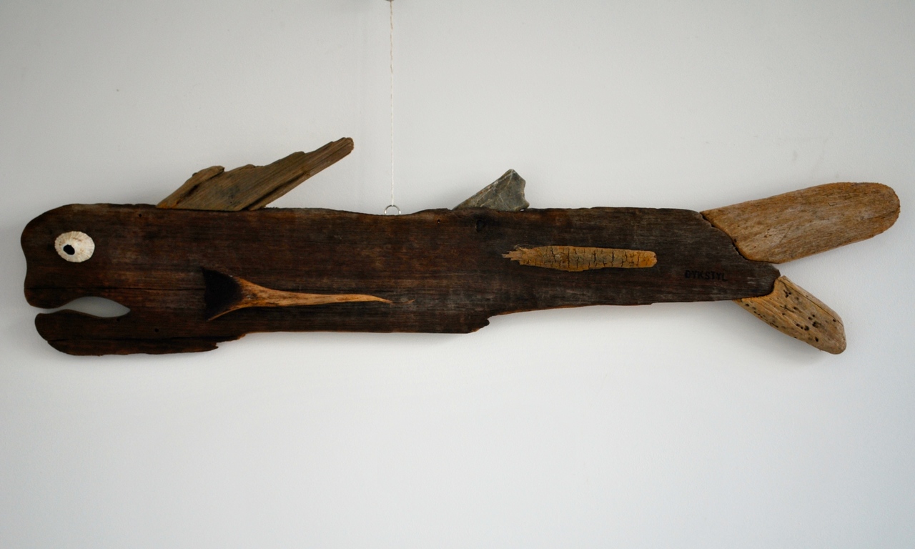 maakt al jaren houten beelden door natuurlijke objecten uit zee te koppelen. De beelden zijn ruw en puur.
