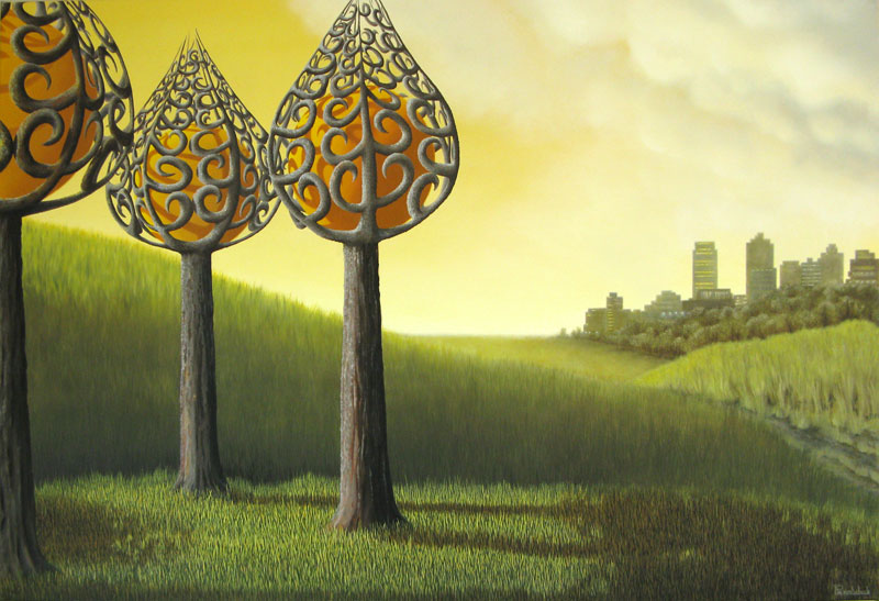 Born in Amsterdam in 1965, Patricia’s life has quite recently changed dramatically. She used to be book-keeper until 2000 when she started the 21st century by becoming a full time professional artist. She moved to the Bay of Plenty in New Zealand in 2005. Since then her work has taken a new direction. Although her style is often regarded as surreal, her work does not strictly fall in that category. Her paintings are apparently simple in composition but executed amazingly detailed and visually very dynamic. Her paintings have realistic elements, but above all an alienating atmosphere. Her works in recent years show landscapes and weird plant species which she calls her psychedelic gardens. `` I consider my work an invitation to explore the ways we experience our environment. My inspirati