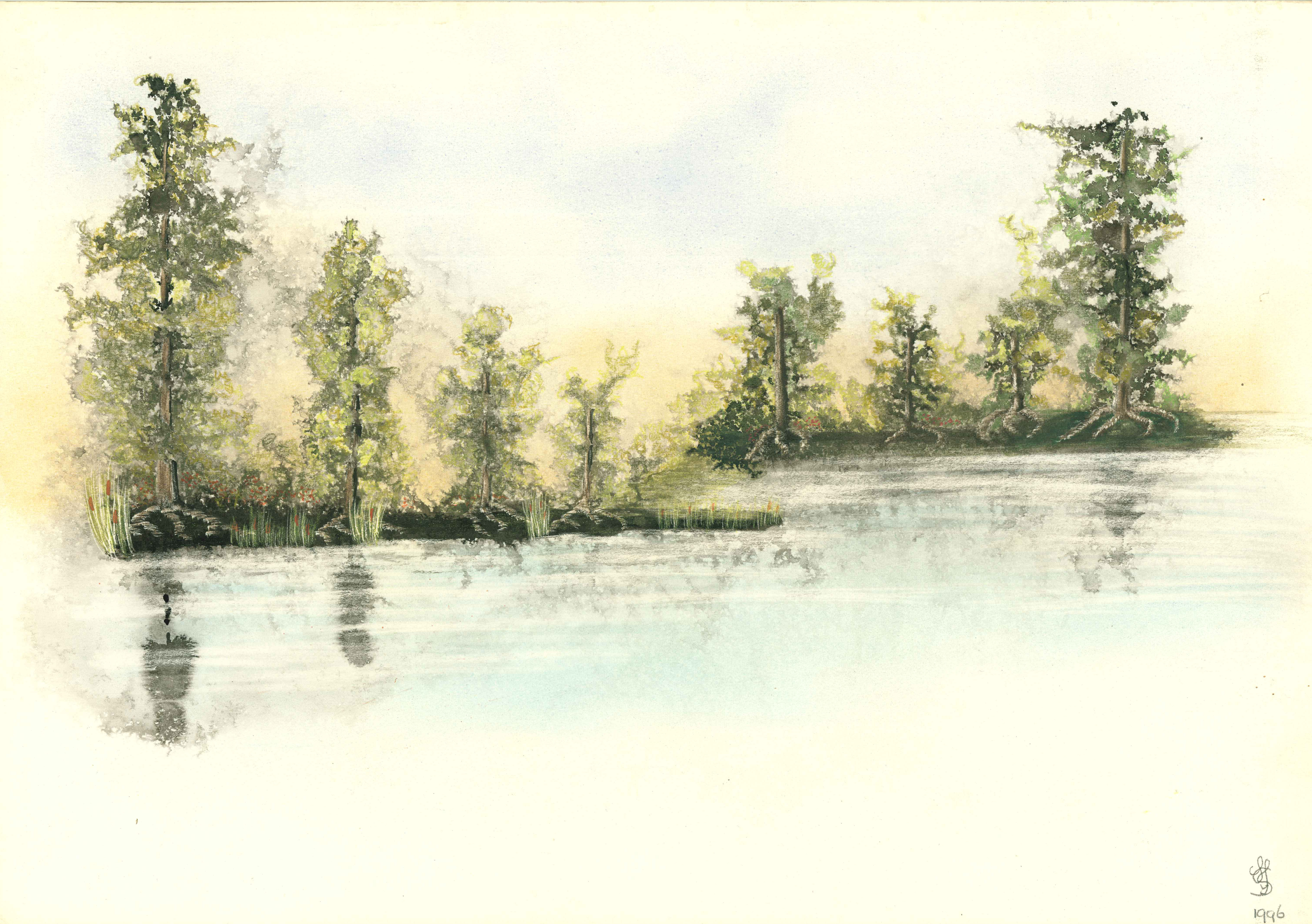Bomen aan de waterkant die worden weerspiegelt in het water