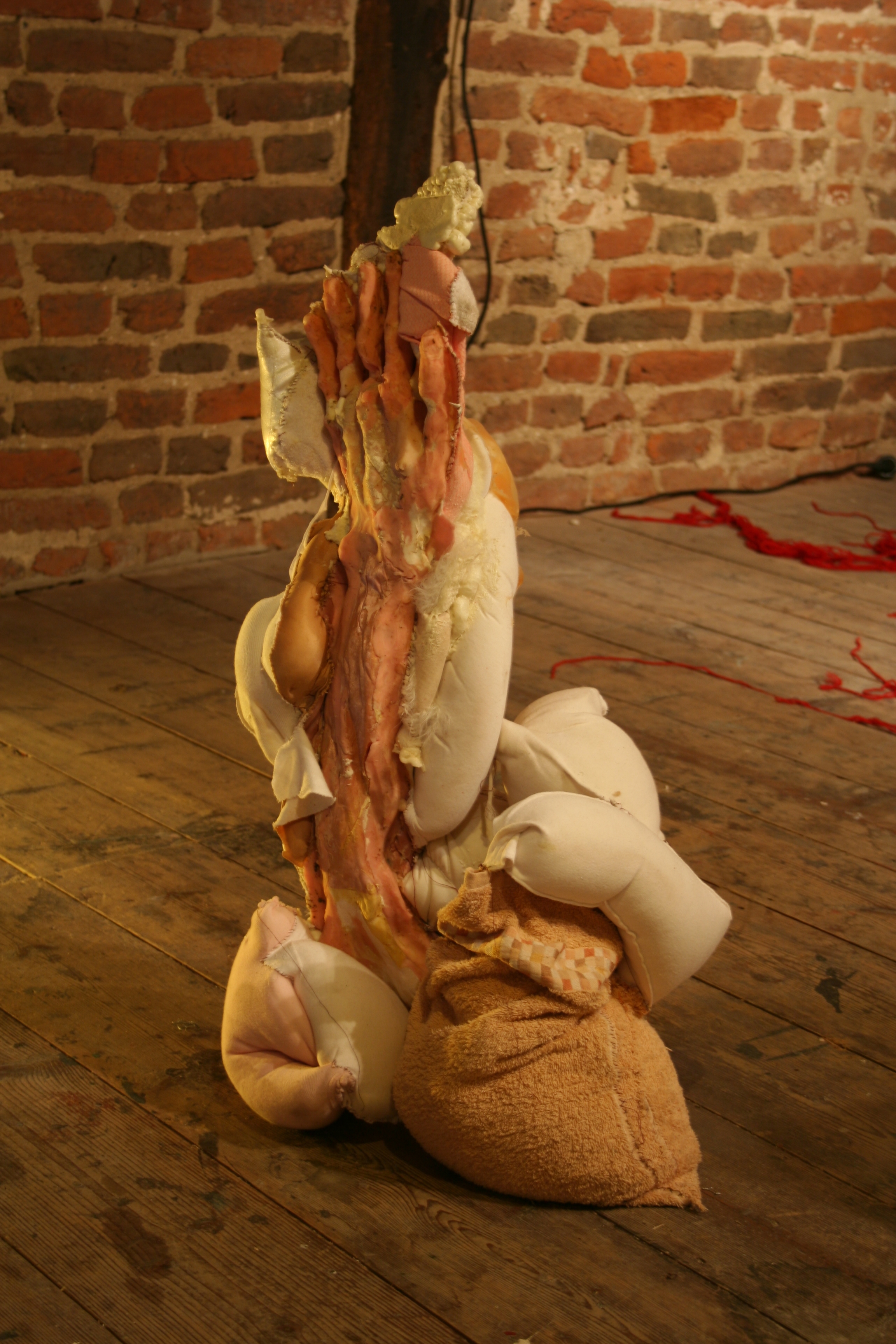 Dit werk is ook in het Langhuis geëxposeerd. Het is een onderdeel van een lichaam, dat ik zijn eigen leven heb laten lijden. Ik koos hier voor een martiaal als gebruikte nachtkleding en tweedehands baby kleertjes ook gebuikte ik weer een combinatie van purschuim en siliconenkit.