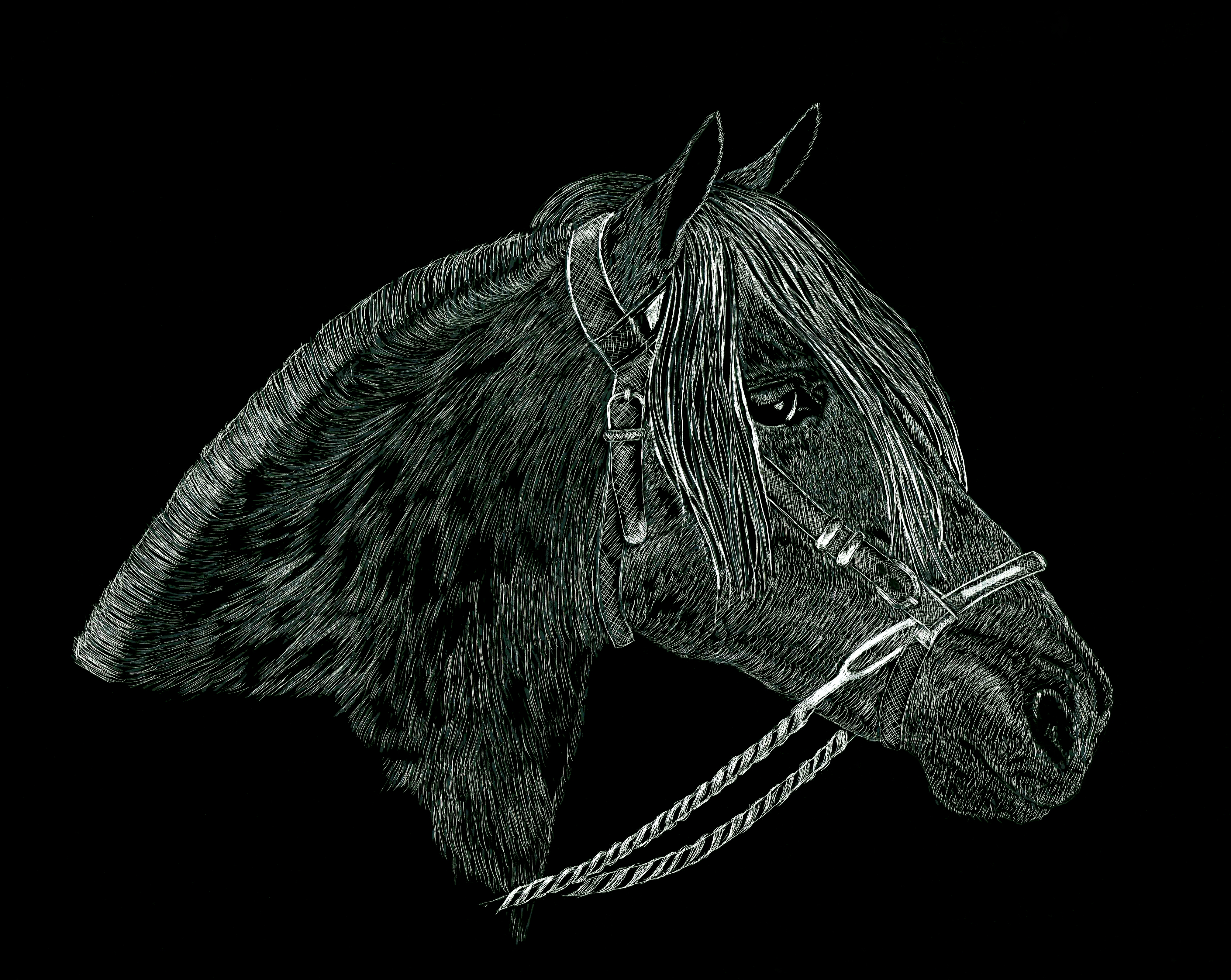 Paardenhoofd met stalhalster Gravure in oostindische inkt