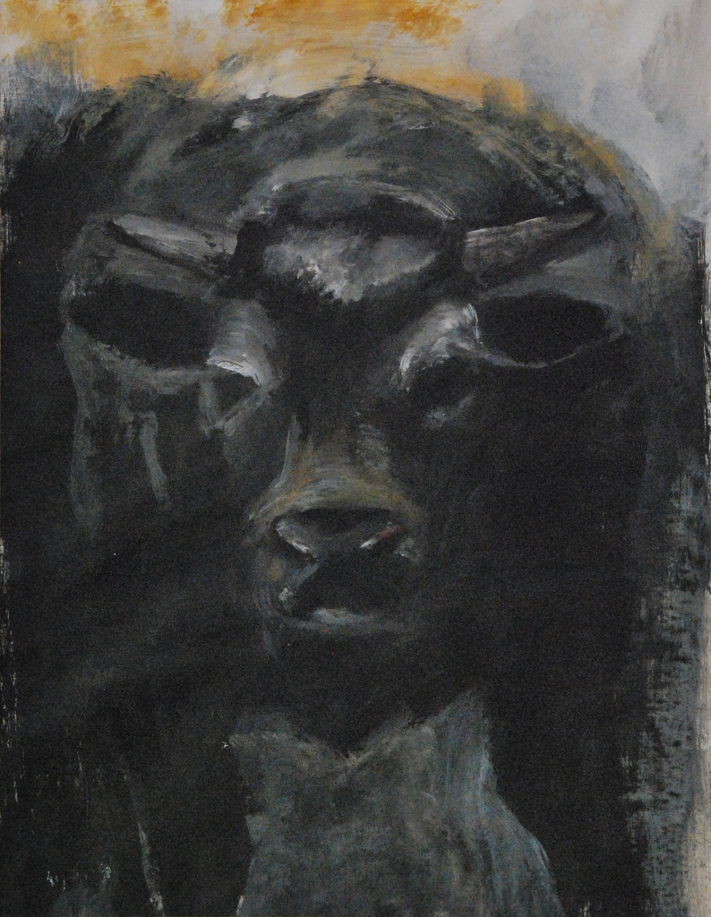 Deze stier heb ik geschilderd naar aanleiding van mijn betrokkenheid bij koeien en stieren. Deze stier kwam ik tegen in Belgie. Het is een machtig dier en hij stond dampend in een wei. Ik was in 1996 bezig met het koeienthema waardoor ik in aanraking kwam met de koeienopvang 'De Leemweg'.