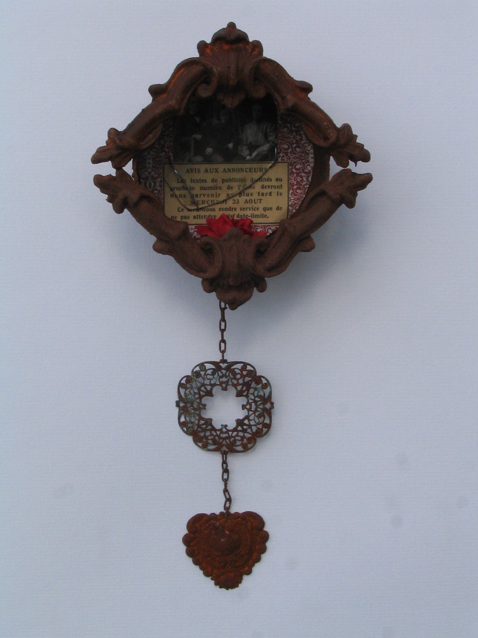Tin Can Assemblage Assemblage van oude foto, oude advertentie glas, papier en roos in metalen blikje