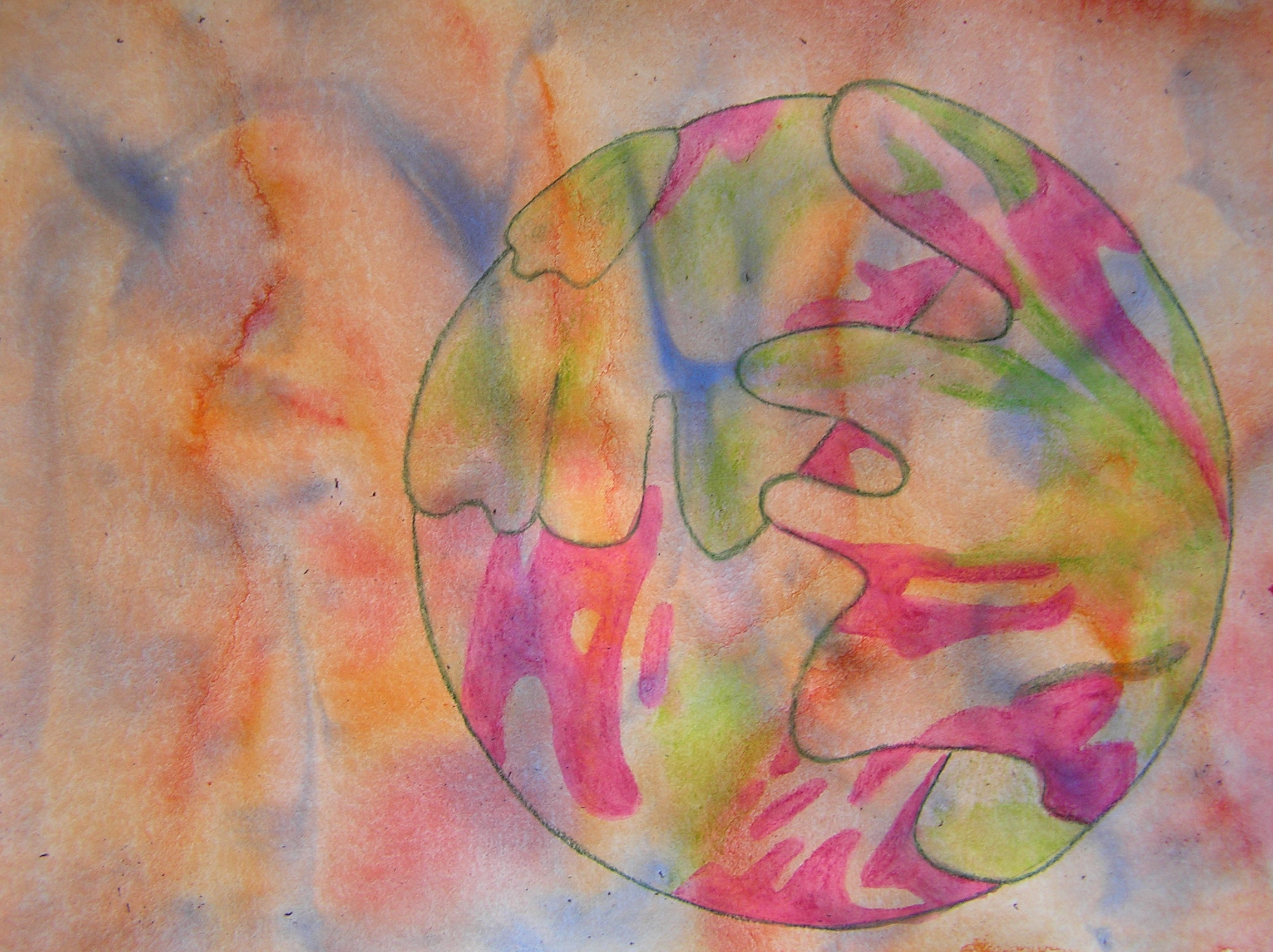 Nat in nat techniek; aquarelverf op nat papier, later bewerkt met aquarelpotlood. De vorm is geinspireerd op een pioenroos.