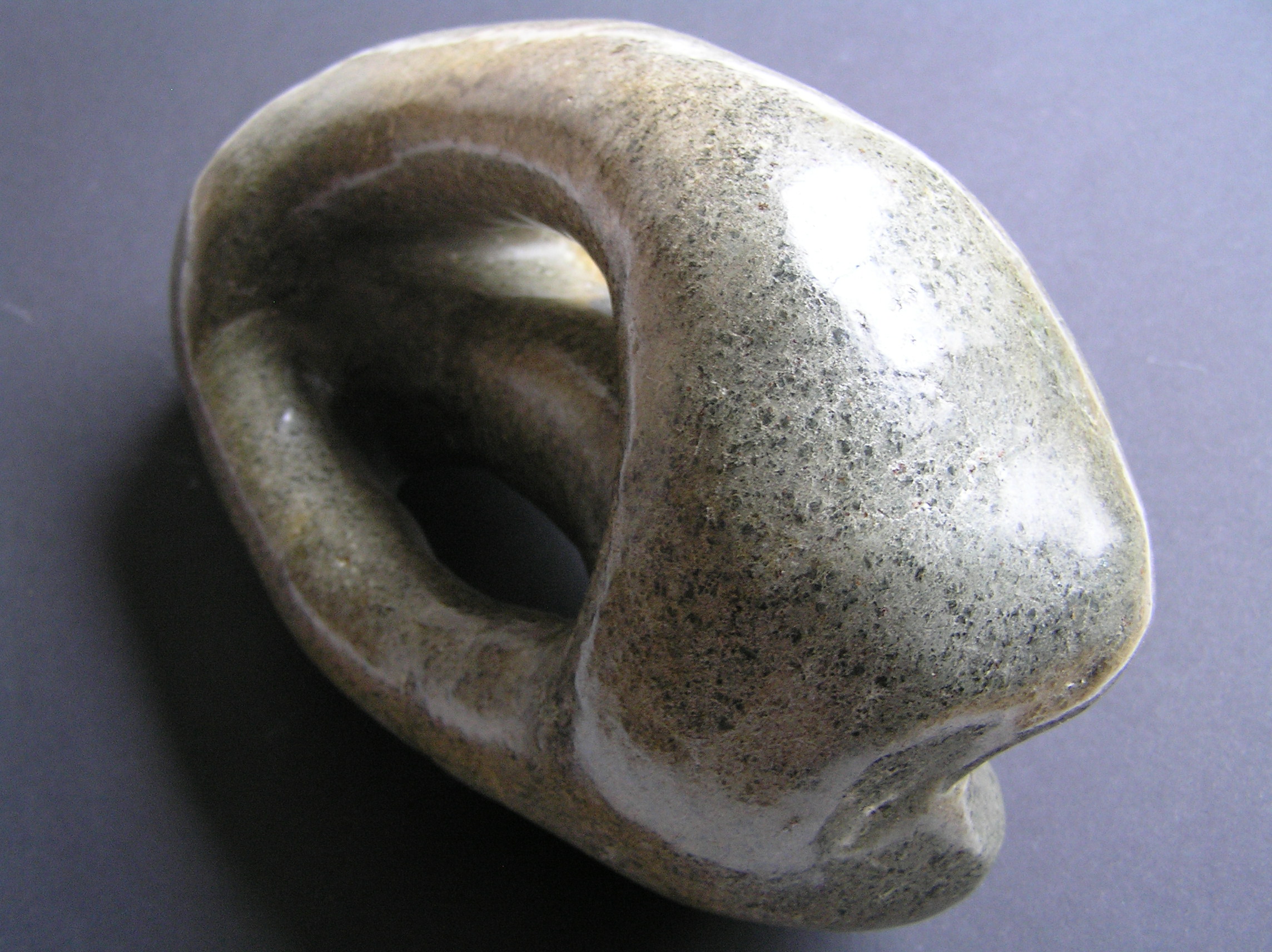 Beeld gemaakt van serpentijn. Beide kanten van het beeld zijn totaal verschillend (zowel in vorm als in kleur van de steen). Dit is een kant.