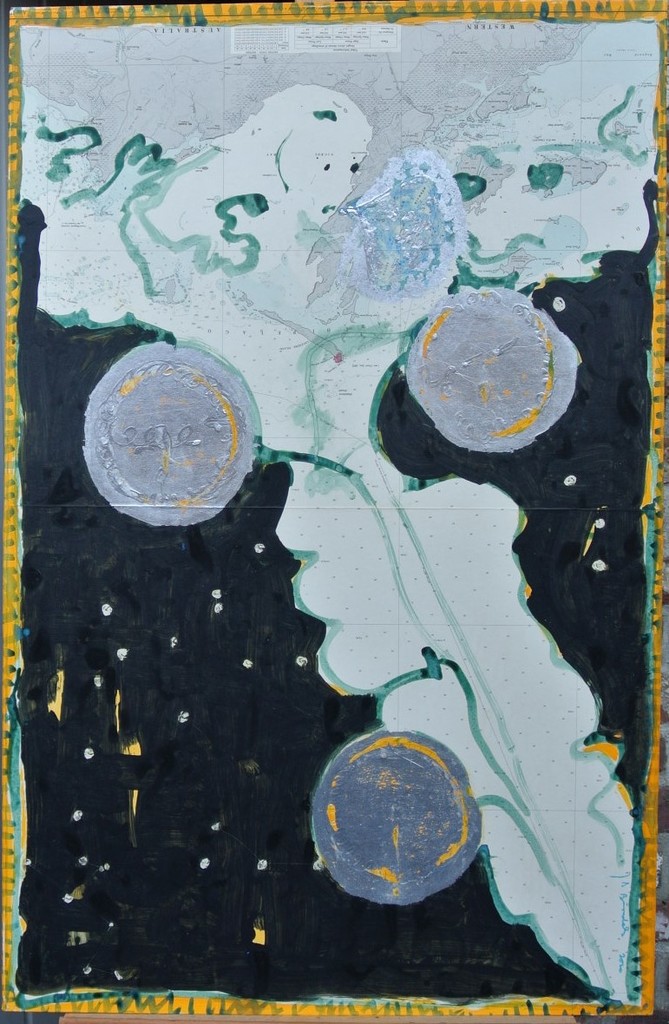 Acryl en bladzilver op zeenavigatiekaart