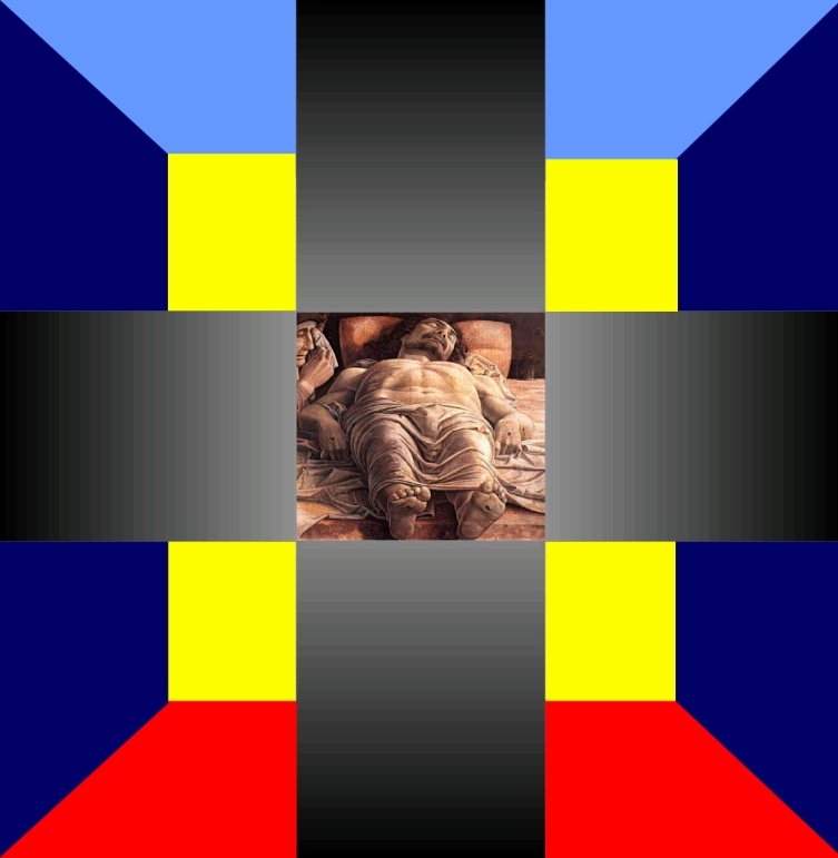 'Ode aan Andrea Mantegna' wil de kunst uit de Italiaanse Renaissance en de Hedendaagse [Computer] Kunst verenigen tot een harmonisch geheel en tegelijkertijd de dingen uit hun functie halen en in een andere context plaatsen. Het ontwerp is, om de perspectivisch verkorte afbeelding van de Dode Christus van Andrea Mantegna heen, door Monica ontworpen en vormgegeven. Michel Martinus, heeft er een gedicht bij gemaakt. [Zie volgende afbeelding]