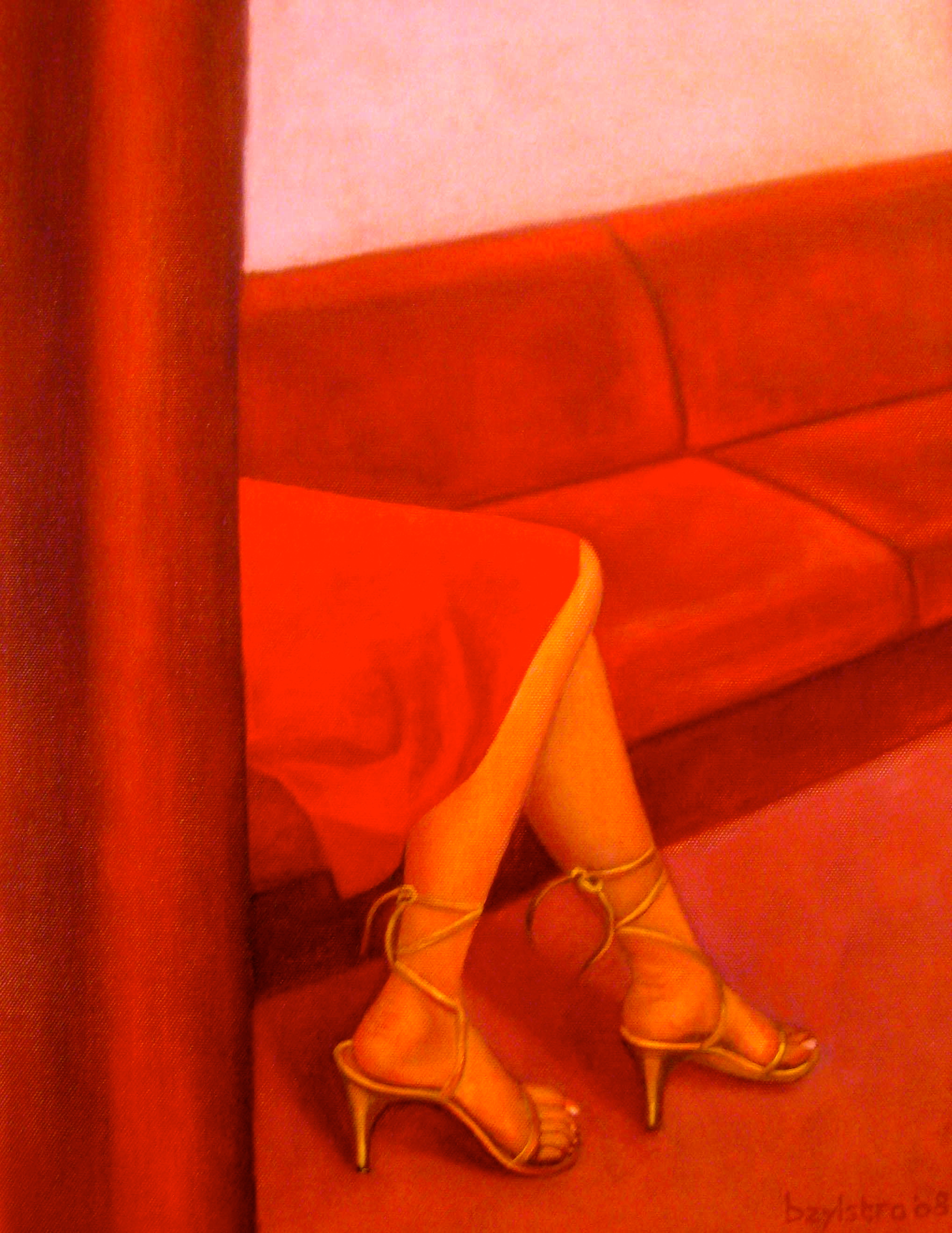 Vrouw zittend op een rode bank achter een gordijn (in de serie 'Vrouwen' is de 'Zichtbaar' versie te zien)