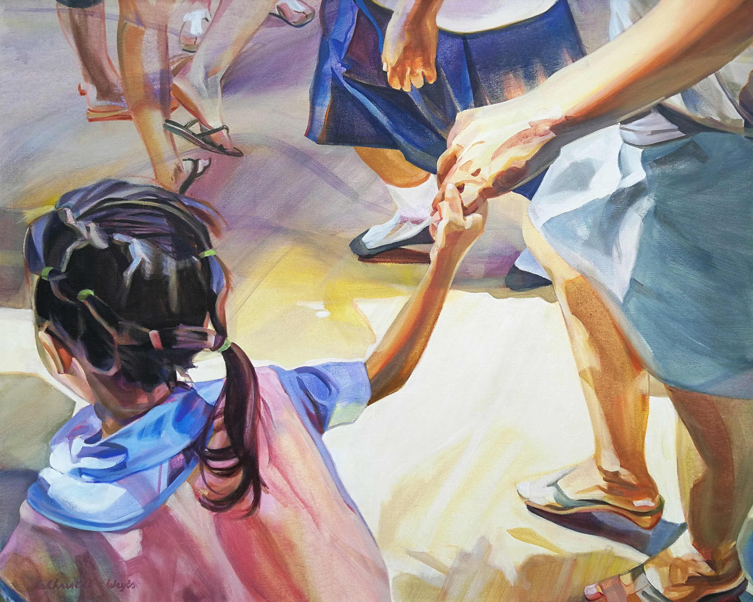 Christel Weyts maakt acrylschilderijen over de mens en zijn leefomgeving. Ze filtert taferelen die vooral het esthetische en de harmonie in een situatie willen benadrukken. Ze houdt aparte composities vast binnen de grenzen van het canvas. Licht en beweging zijn hierbij vaak belangrijk.