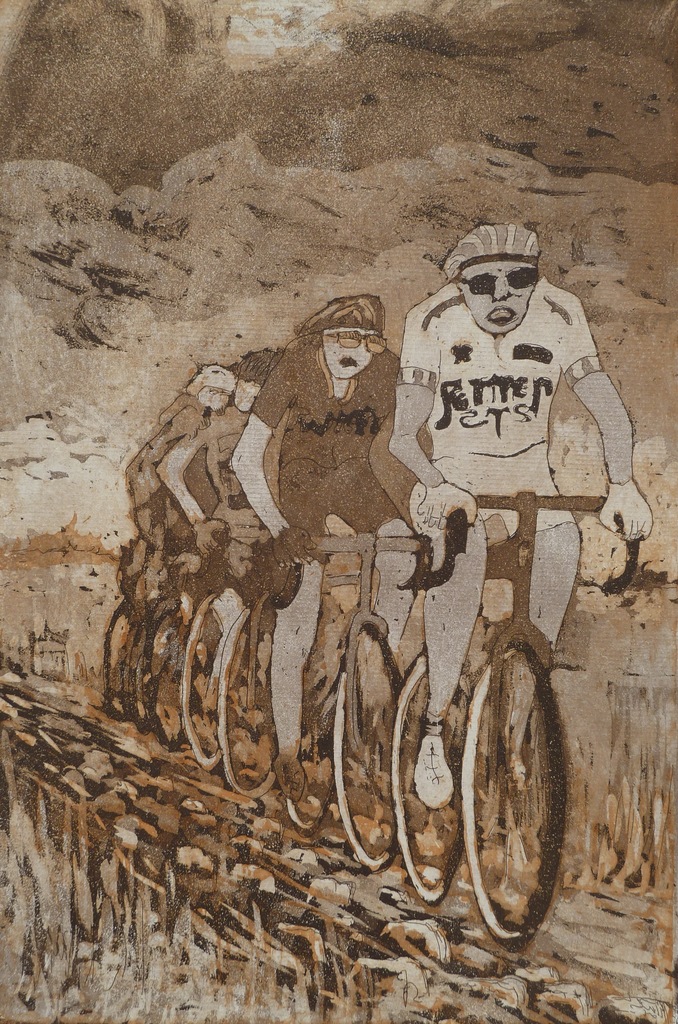 deze ets in dubbeldruk is een beeld van de Hel van het Noorden, oftewel Parijs-Roubaix, een eendaagse wielerwedstrijd in het voorjaar, waarbij fysiek heel veel van de renners wordt gevraagd.