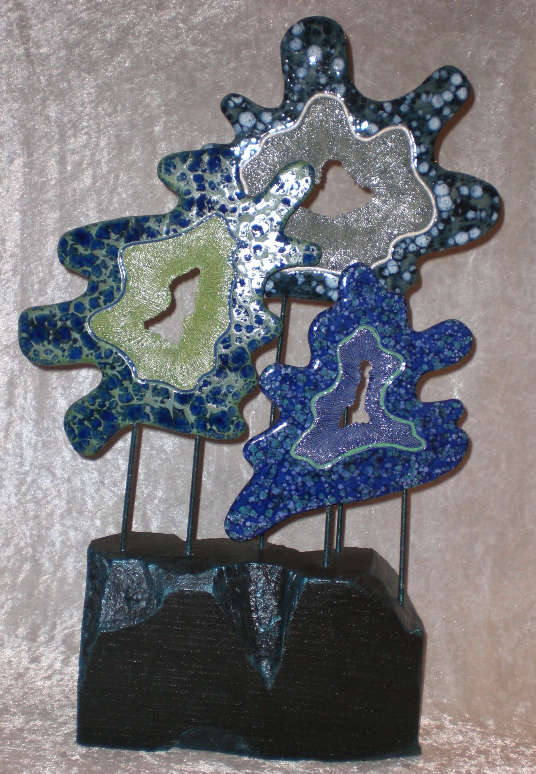 Ontdekking van de oervorm begint bij de amoebes. Deze vormen zijn kenmerkend door de uitstulpingen De afwerking is in een kristalglazuur, gezet op steen.
