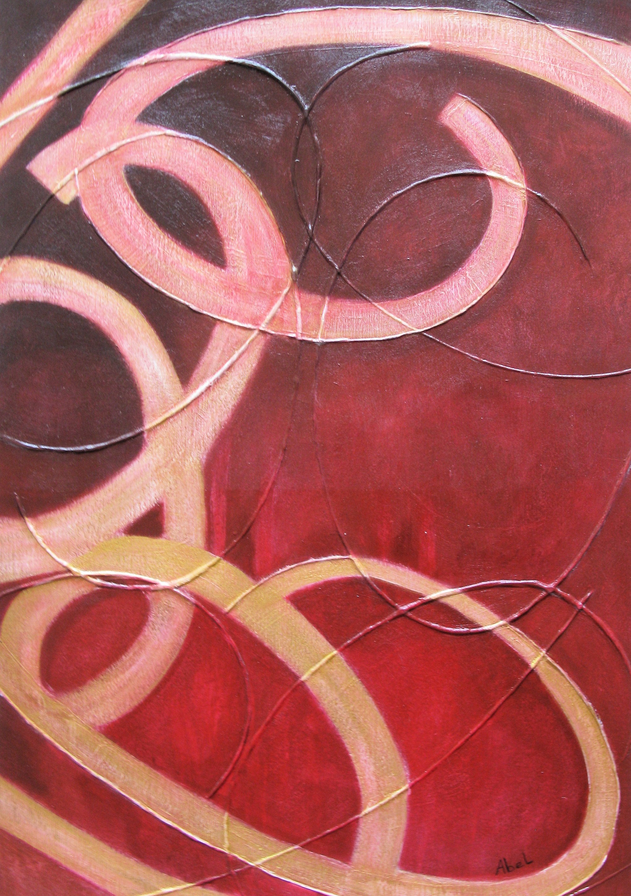 Meegeven,mee bewegen en door bewegen als de dans of sprong om het leven.Gebogen vormen in beweging qua vorm, structuur en invulling.Warm.Vorm als gebondenheid in een verbonden zijn met iets als een geheel vormend.