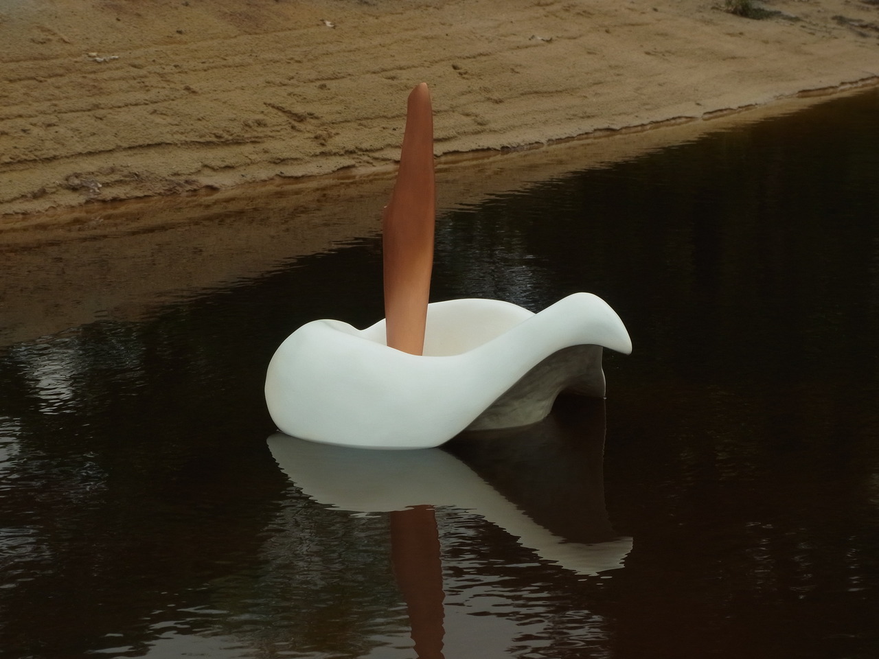 dit beeld van epoxy drijft op het water. Is het een aronskelk of een vogel?..........an epoxy sculpture floats on the water. Is it an arum or a bird?