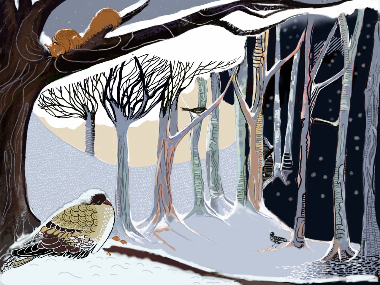 De Winter kwam. Sneeuw kleurde het bos wit. Eekhoorn maakte zich zorgen. Zou Duif niet vastvriezen?