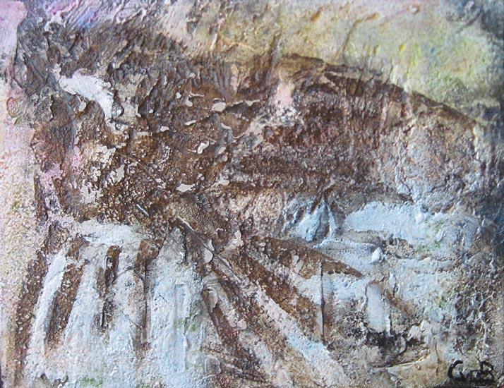Carla van den Berg werkt vnl met acryl/mixed media op doek en op eigen handgeperst papier, soms worden daar ook takjes of draadjes raffia in verwerkt.