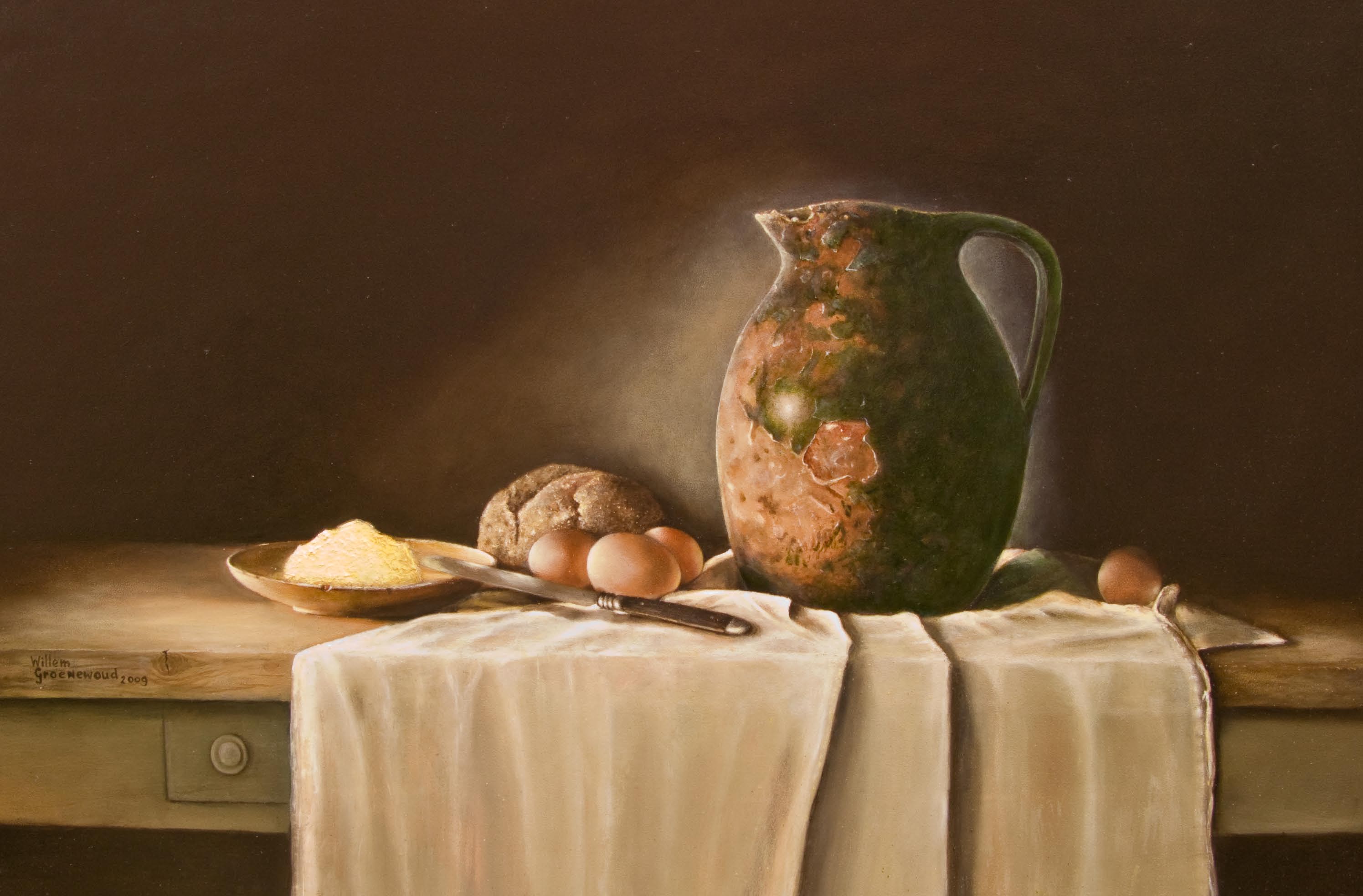 Stilleven van een melkkan, eieren, brood en boter.Olieverf op paneel. ( Finaleplaats Ned.Ac. voor Beeldende Kunst, tevens finale plaats Coda museum. Apeldoorn.)