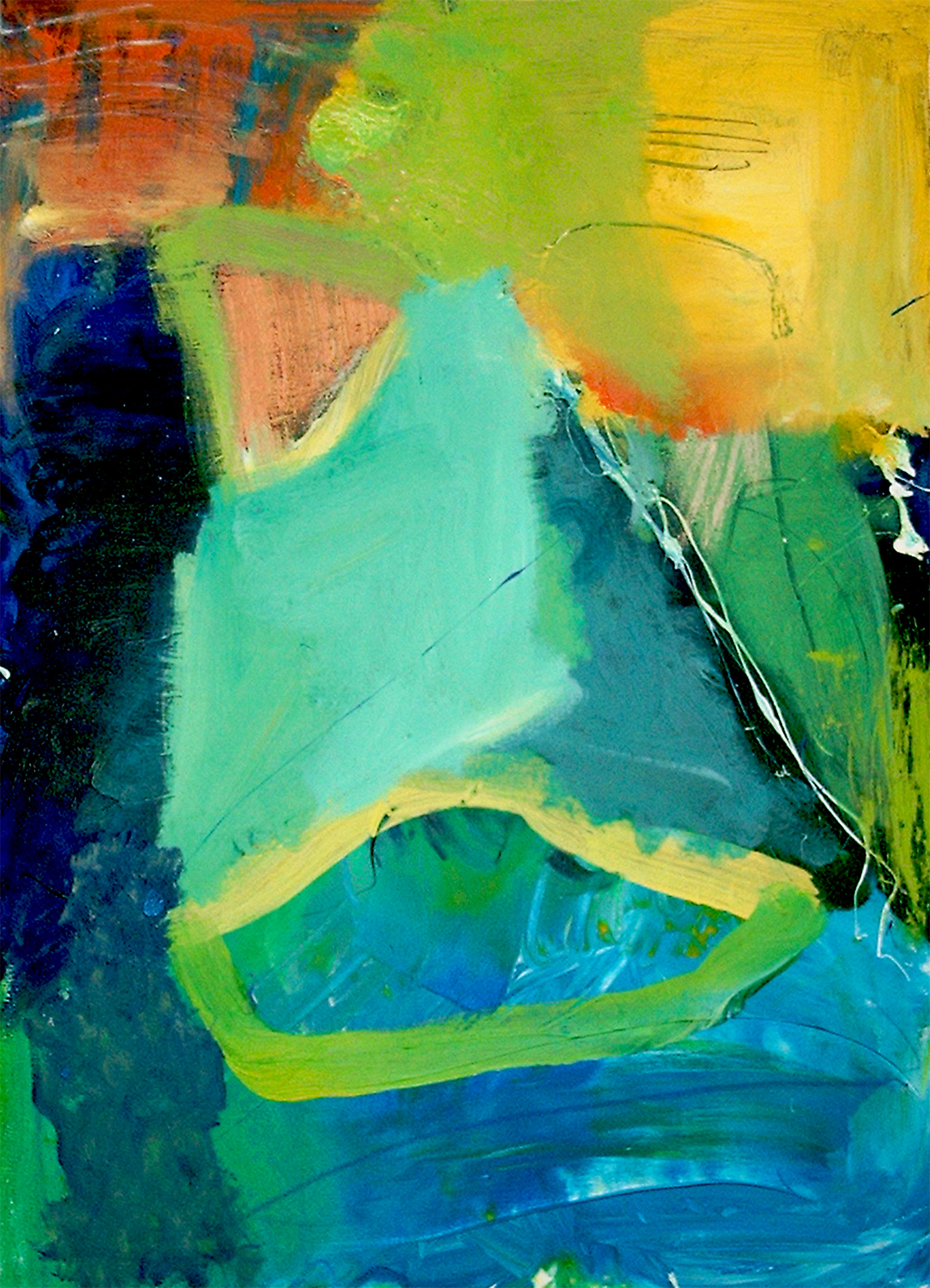 vrij, intuitief, niet van te voren bedacht, ook met krijt, verder acryl, geheel nieuwe kleurcombinaties voor mij, veelal abstrakt