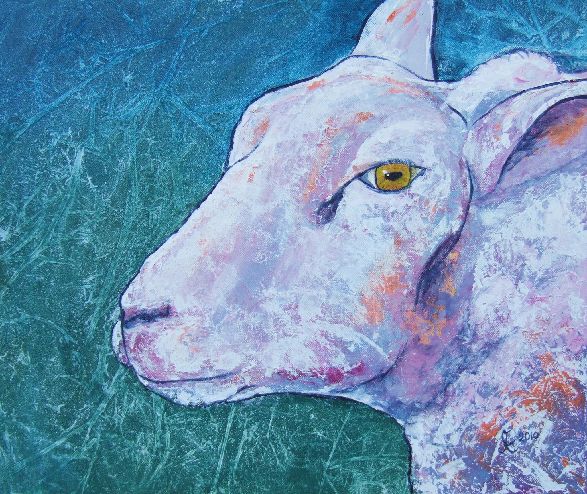 Schapenkop met dromerige blik in de ogen. Expressief geschilderd. Geïnspireerd op een foto van Corné van den Bosch.
