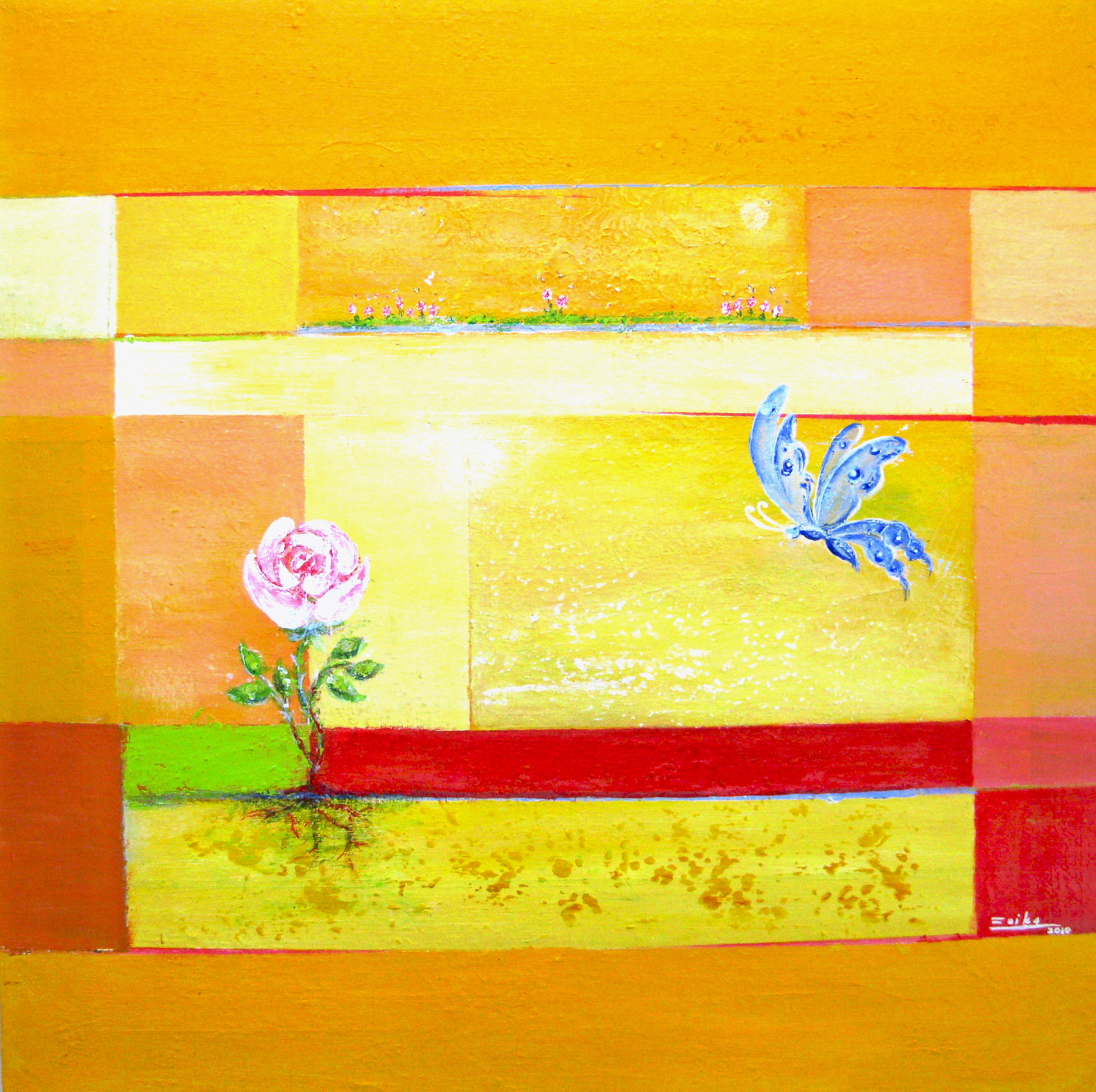 De schilderijen van Erika zijn veelzijdig, kleurrijk en dynamisch. Zij hanteert verschillende technieken; zoals aquarelleren, tekenen met pastelkrijt en schilderen met acrylverf. ,et acryl werkt ze het liefst abstract-expressief. Geïnspireerd door beeld, vorm, kleur en klank verwoordt zij in kleurkrachtige beeldtaal de complexiteit van emoties in een zoektocht naar harmonie.