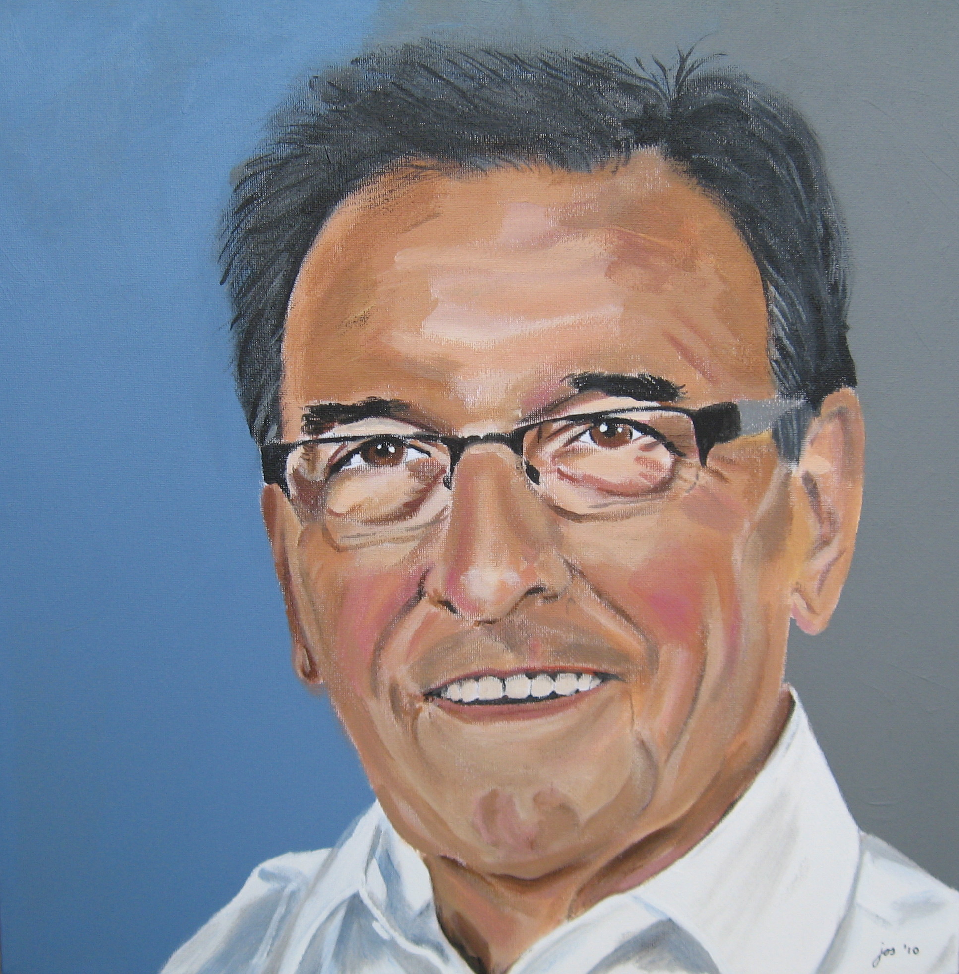 Jos van der Zee(1953) Begin 2007 gestart met acryl. De onderwerpen variëren sterk, maar het maken van portretten is favoriet. De grootste uitdaging ligt in het treffen van de juiste oogopslag. Door de Q-koorts (zie afbeelding) lukte het op een gegeven moment (2018) niet meer om regelmatig op grotere doeken te schilderen met acryl. Overgeschakeld naar portrettekenen met kleurpotloden. En dat bevalt heel goed.