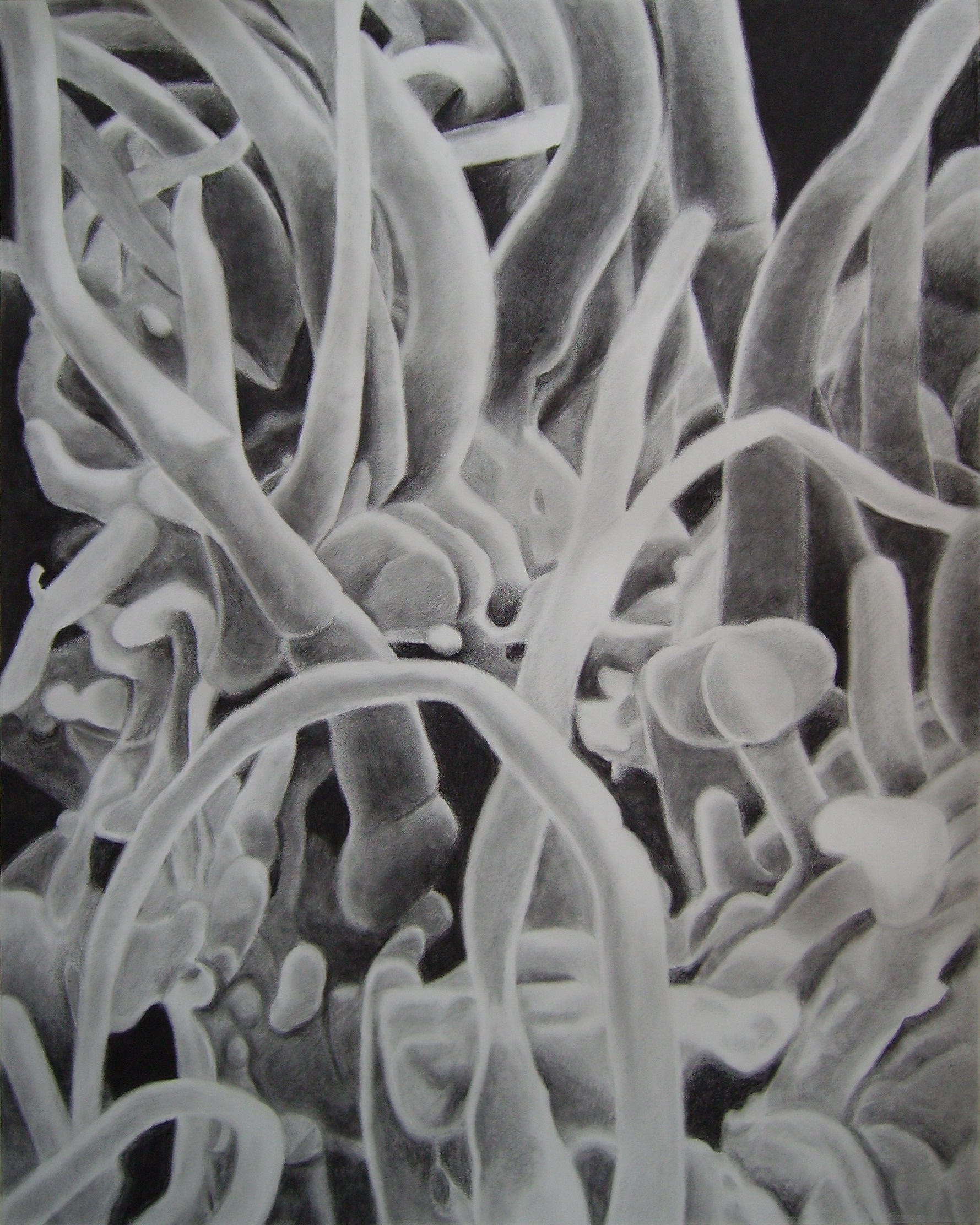 Eric Vandamme (Mechelen, België)maakt voor zijn schilderijen en tekeningen gebruik van fotografisch beeldmateriaal van het internet, uit boeken en tijdschriften. De beelden zijn voor het merendeel afkomstig uit wetenschappelijke domeinen als genetica, microbiologie en nanotechnologie. Vandamme manipuleert ze met fotobewerkingsprogramma’s op de computer: hij verandert de uitsneden en de verhoudingen, vergroot details uit, herschikt de beelden en past de kleuren aan. Zo hercontextualiseert hij ze en construeert hij een nieuwe, vervreemdende werkelijkheid van bizarre stillevens en desolate landschappen die er eigenlijk geen zijn.