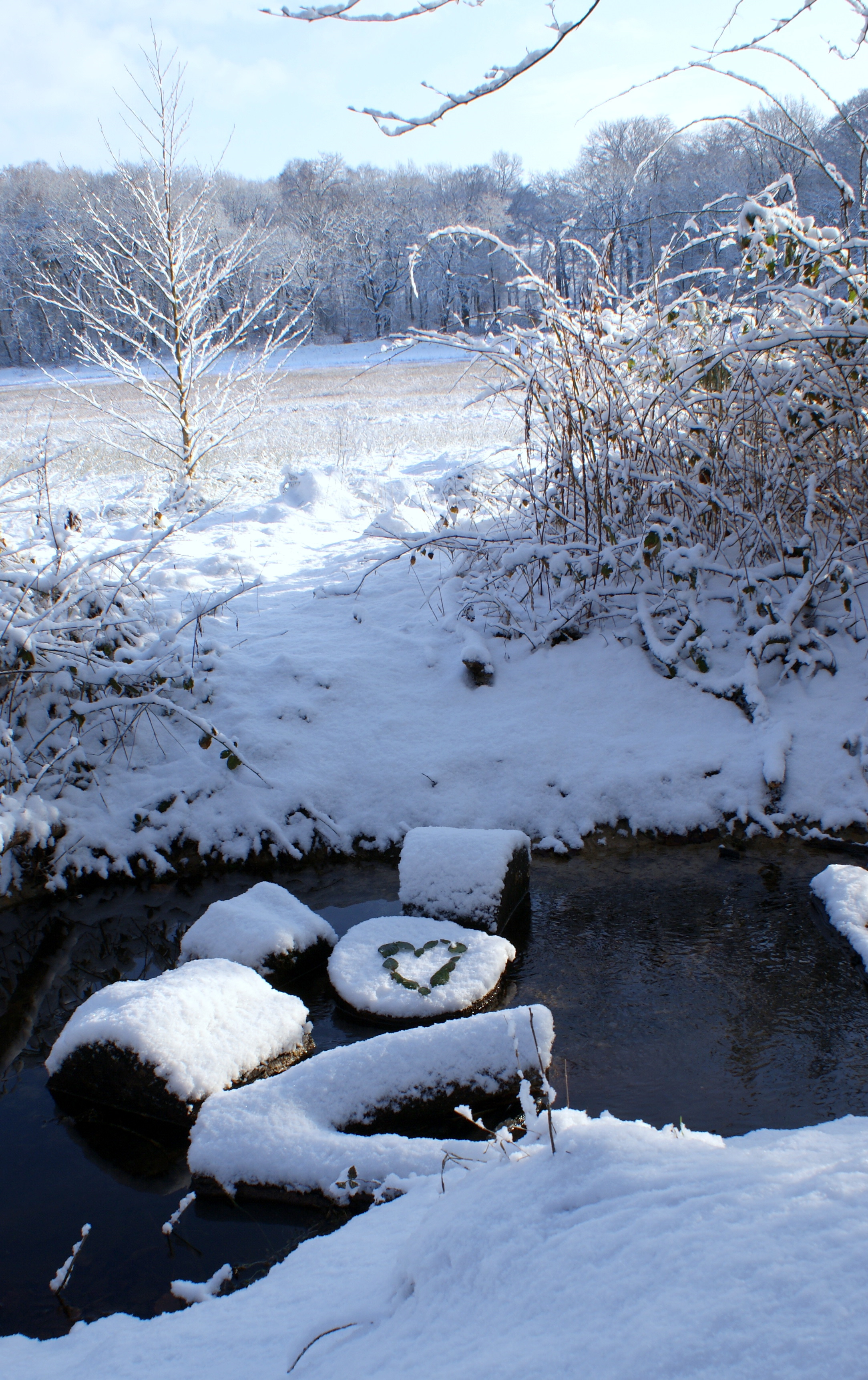 Een hart gelegd van braamblad in de sneeuw op een boomstronk in de Renkumse beek met uitzicht over het beekdal. De foto is in verschillende grootte en op verschillend materiaal te verkrijgen