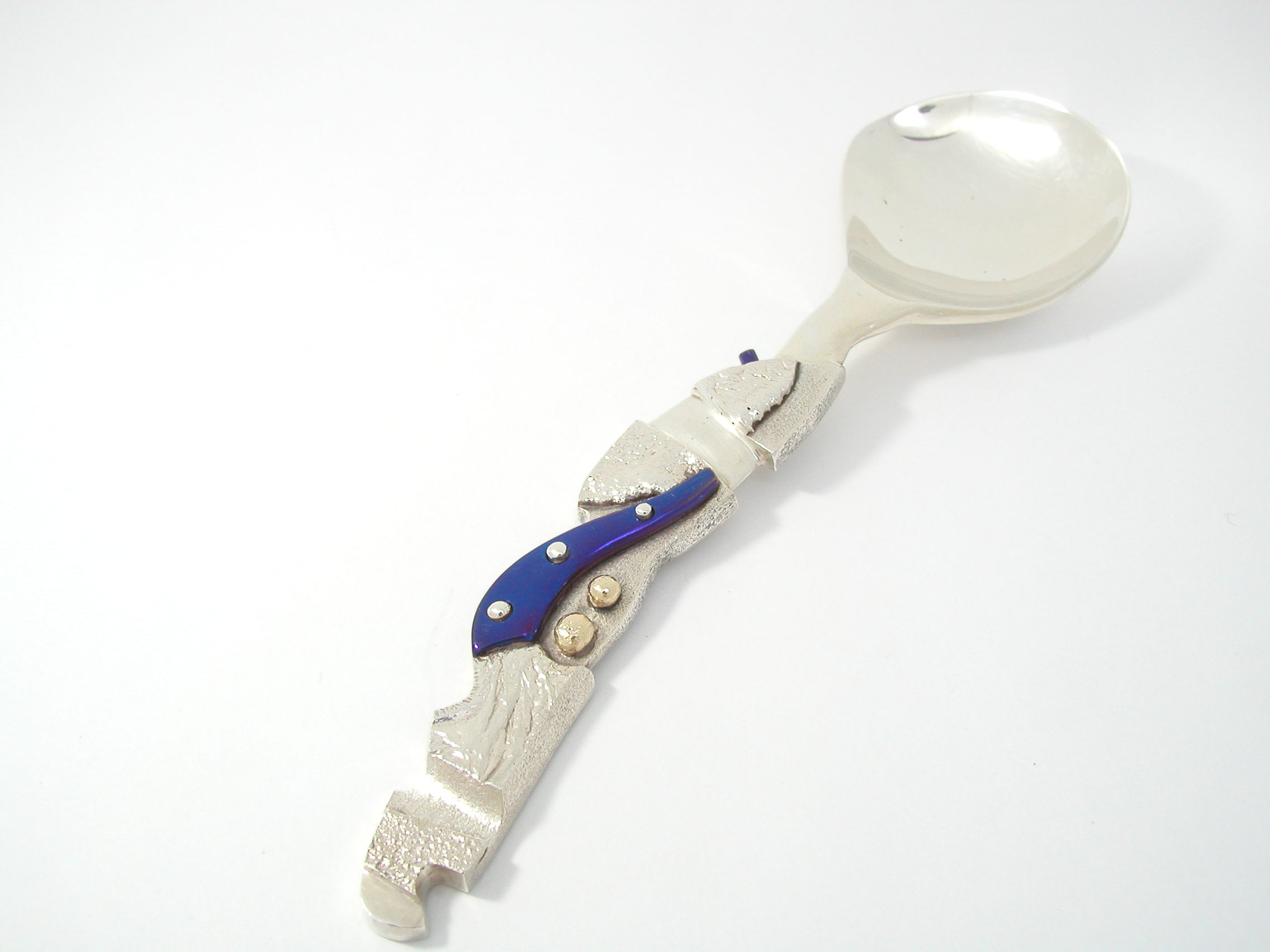 Suikerlepel gemaakt van zilver, geelgoud en blauw gekleurd titanium.