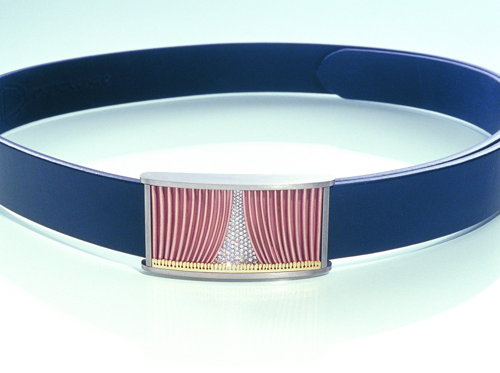 Nominatie Nederlandse Ontwerpwedstrijd (NOW) 2003. Riemgesp uitgevoerd in titanium, geel-, rood- en witgoud en bezet met ruim drie caraat witte diamanten. Met zwarte kalfslederen riem.