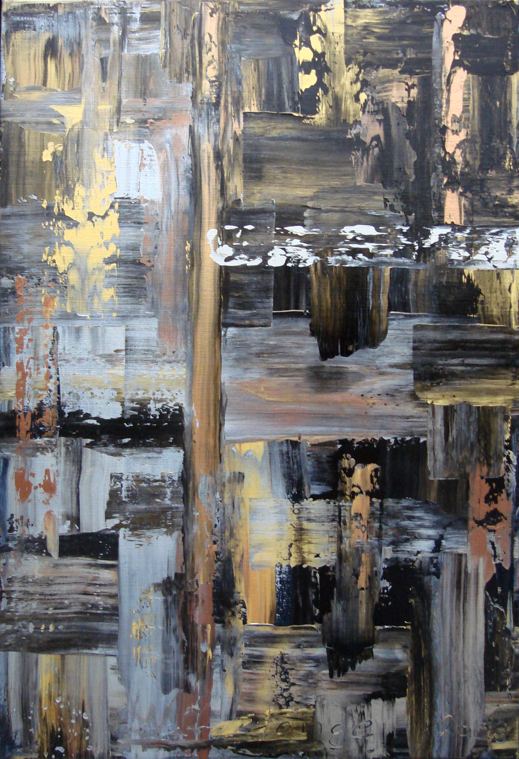 Metallic Metropole Acrylverf op linnen doek bespannen op een alluminium frame. Verschillende tinten metallic-verf gecombineerd met zwart. Afwerking met hoogglans vernislaag In een mat zwarte baklijst.