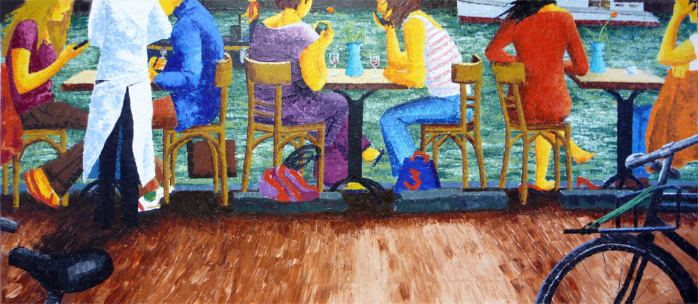 Tafereel aan de Prinsengracht te Amsterdam. De eigenaar van het restaurant naast de galerie had de tafeltjes op een zonnige zondag op de kade gezet. Verkocht.