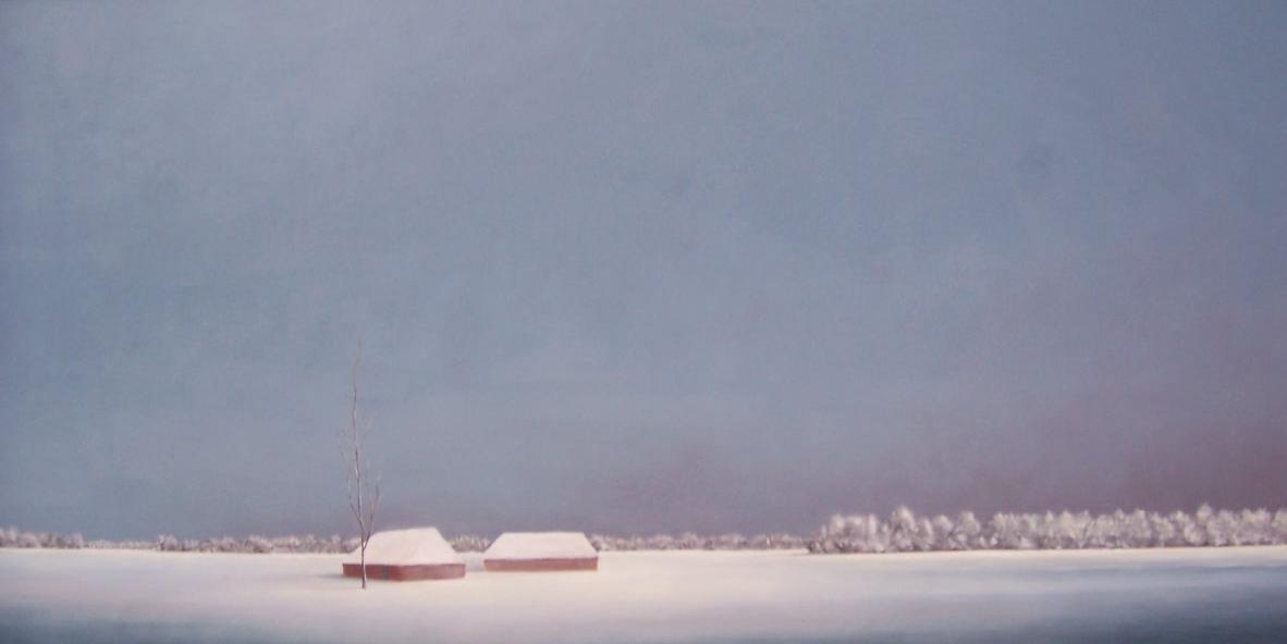 huisjes in besneeuwde vlakte ,waarin het licht de verstilling benadrukt.