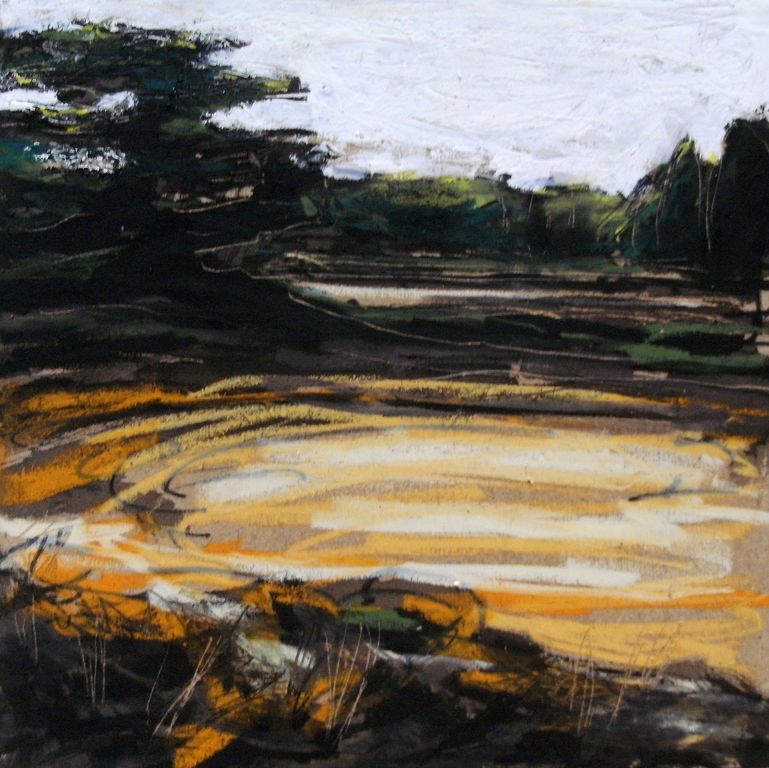 Oliepastel schets van het beekhuizerzand in september. Compleet met zwarte baklijst (23.5 x 23.5 cm)